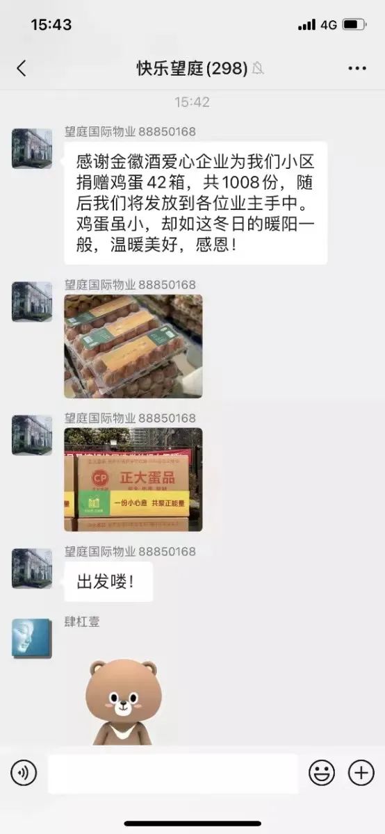 四辆车将鸡蛋运到高新区云顶花园集合点后,陕西省慈善联合会、复鑫基金会、金徽酒和陕西供销电子商务集团一起组织了一个简单的志愿者出征仪式。之后,四个小组的志愿者各驾一辆车,将鸡蛋分发给18个社区的社区物业。为保证鸡蛋能派发到每户居民手里,志愿者们一一编好短信,要物业当着他们的面发到业主群,然后才去下一个小区。发完鸡蛋后还对每家物业进行回访,收集了业主们的许多反馈信息。