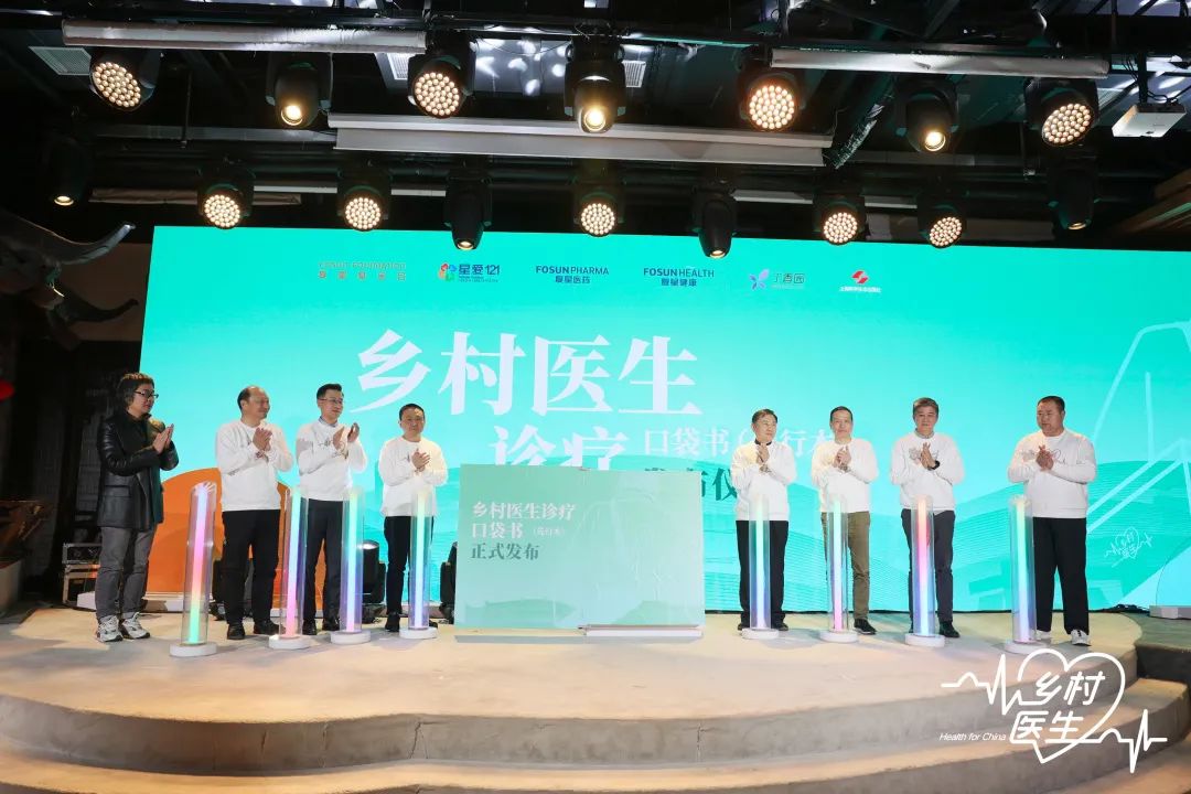 ▲复鑫国际联席首席执行官陈启宇,复鑫国际执行总裁、复鑫基金会理事长李海峰,复鑫医药董事长兼首席执行官吴以芳等共同见证《乡村医生口袋诊疗书(先行本)》发布