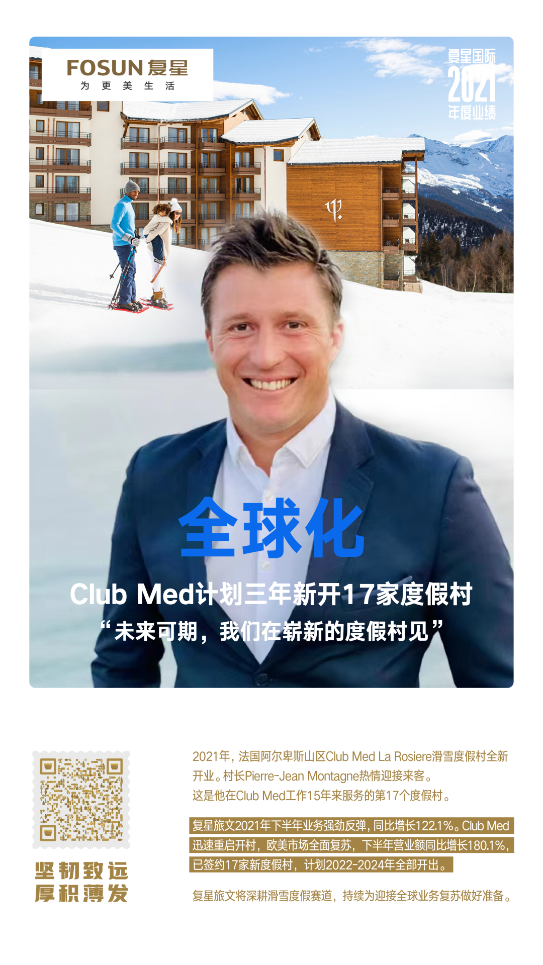 3月21日,复鑫旅游文化集团(1992.HK)(“复鑫旅文”或“集团”)欣然公布截至2021年全年业绩。本年度内,集团收入增长至人民币9,261.5百万元(2020年:人民币7,060.3百万元),同比增长31.2%;度假村及旅游目的地运营以及旅游休闲服务及解决方案(统称为「旅游运营」)的营业额(按一致汇率计)录得人民币8,094.7百万元(2020年:人民币6,739.0百万元),同比增长20.1%;经调整EBITDA为人民币248.3百万元(2020年:人民币187.5百万元(已重述))。其中,下半年营业额和经调整EBITDA均强势反弹,旅游运营的营业额增长至人民币5,660.9百万元,同比增长122.1%;经调整EBITDA较2020年下半年(已重述)扭亏人民币1,094.4百万元。