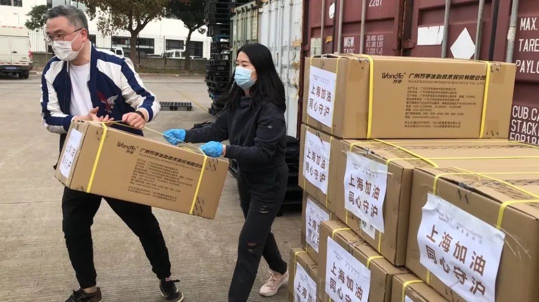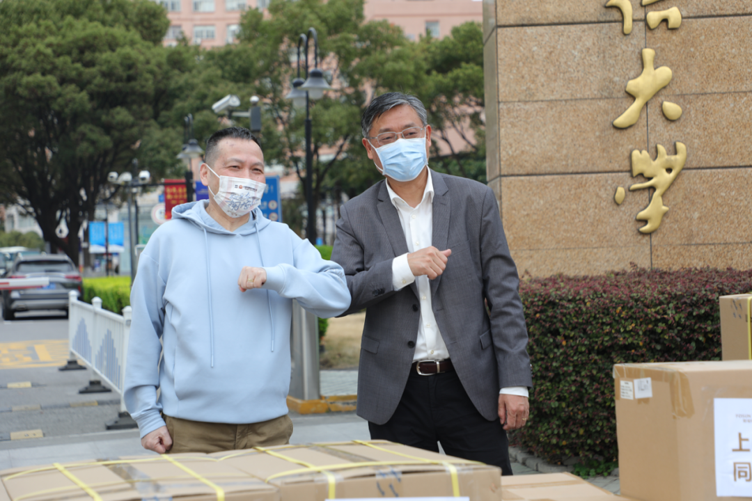 16日下午四点半,首发车队准时将几十箱口罩送到上外校门口,从需求提出到完成交付用时不到24小时。与此同时,另外一组员工志愿者带队把10200份抗疫物资送到了上海交大闵行校区。