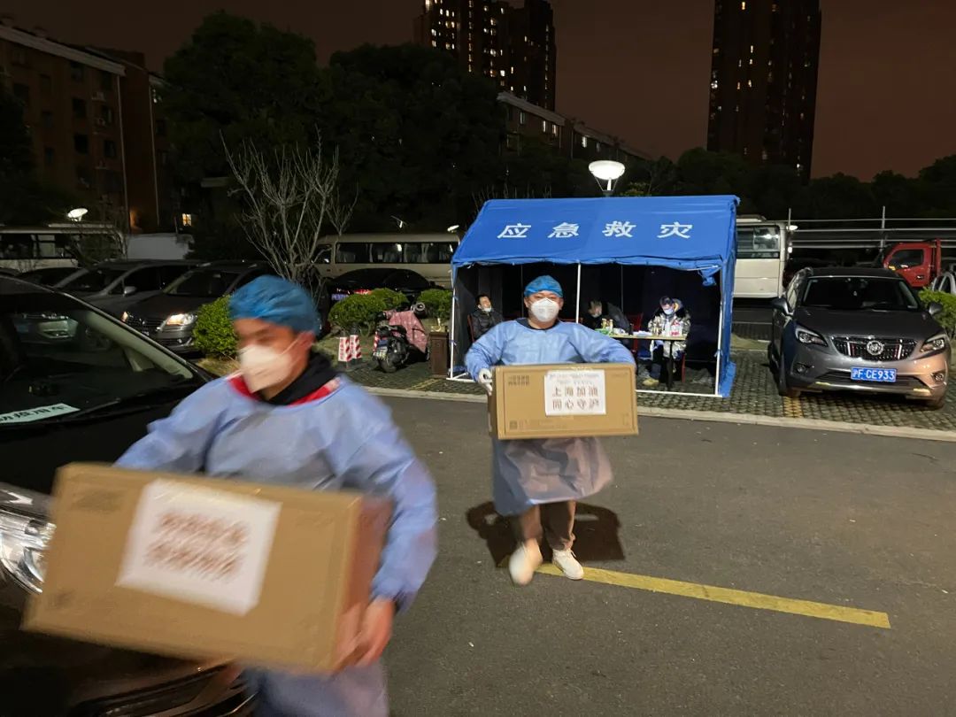 晚上8点,两支战队和从指挥部赶来接应的同事汇合,将这批应急物资交给了闵行区梅陇镇卫生院。