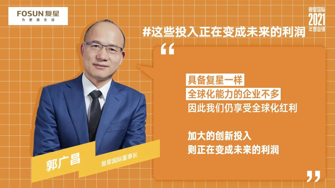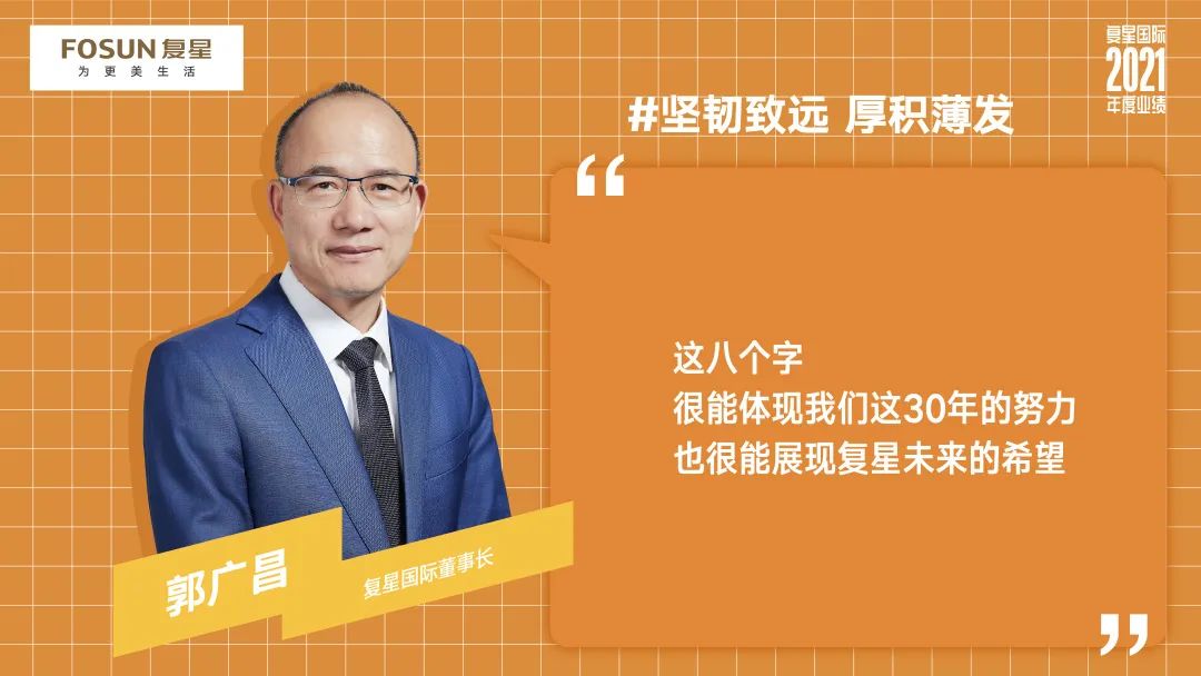 “坚韧致远、厚积薄发,这八个字很能体现我们这三十年的努力,也很能展现未来的希望。”郭广昌表示,经过三十年发展,复鑫已发展成为国内少数既具备全球化运营与投资能力,又积累了深厚科技与创新能力的企业。复鑫的全球化能力未来会创造更大价值,持续不断的创新投入也会变成未来发展的红利,“复鑫经过三十年的发展,现在到了应该能够为股东带来更多、更好回报的时候了。”