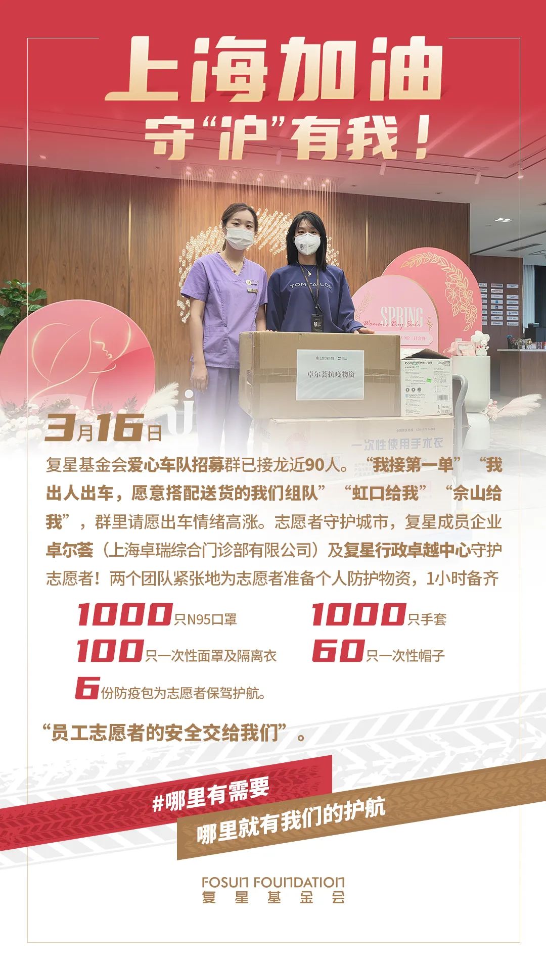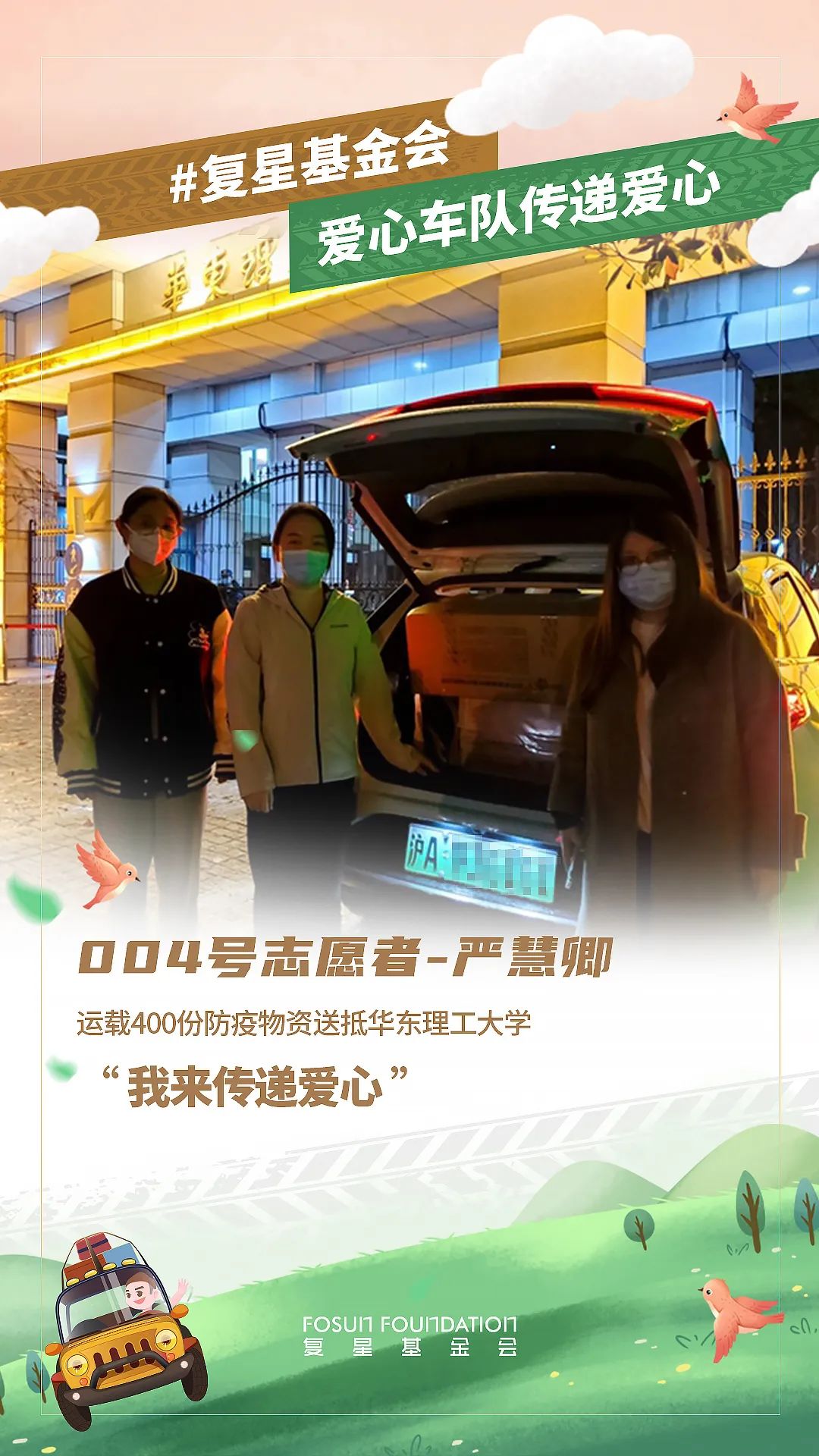 15日下午,复鑫基金会发布组建爱心车队信息,短短3小时,66位员工接龙响应。16日,编号001车队的7名员工志愿者执行驰援上外任务,从“接单”到完成交货用时不到24个钟头。17日下午,002号车队由复鑫公共事务与企业传播中心总经理祝文魁带队,与3名员工志愿者一起向宝山区卫健委送去一万件防疫物资。