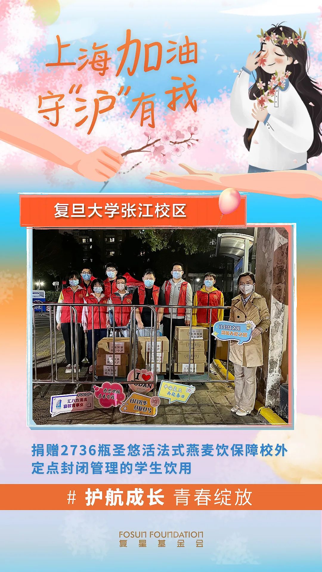 像袁文婕一样利用“职务之便”回到母校的还有不少:复鑫商社董事会办公室组长崔琳傍晚在复旦大学张江校区送完燕麦饮后,和学弟学妹们“隔栅”合影。复鑫基金会副总监裴琼在上外校门口交接完物资后,“隔空”欣赏了校园内怒放的玉兰花…… 复鑫基金会下一步将继续紧盯高校需求,借助员工爱心车队等力量纾困这些临时被“封印”的万人大社区。