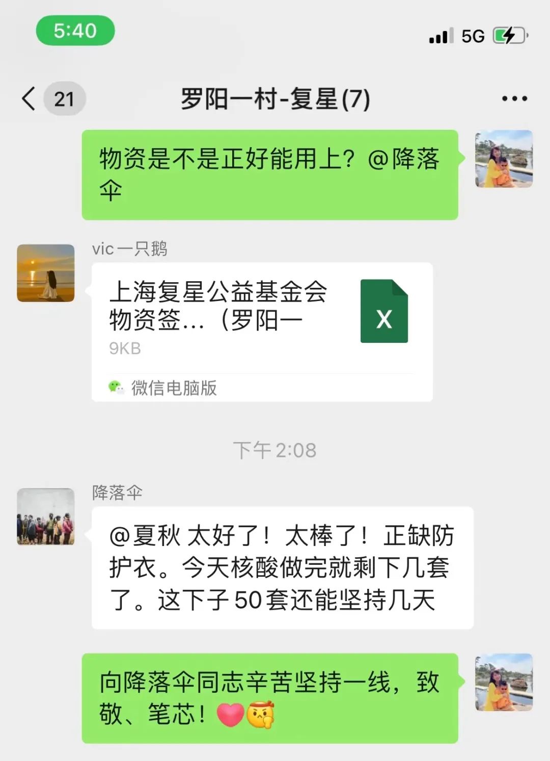 昵称“降落伞”的志愿者在群里@复鑫基金会员工刘夏秋。4月4日送达闵行区罗阳一村的防疫物资顺利衔接上前面一批。