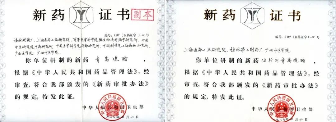 1987年注射用青蒿琥酯获颁中国卫生部X-02号新药证书(右图)