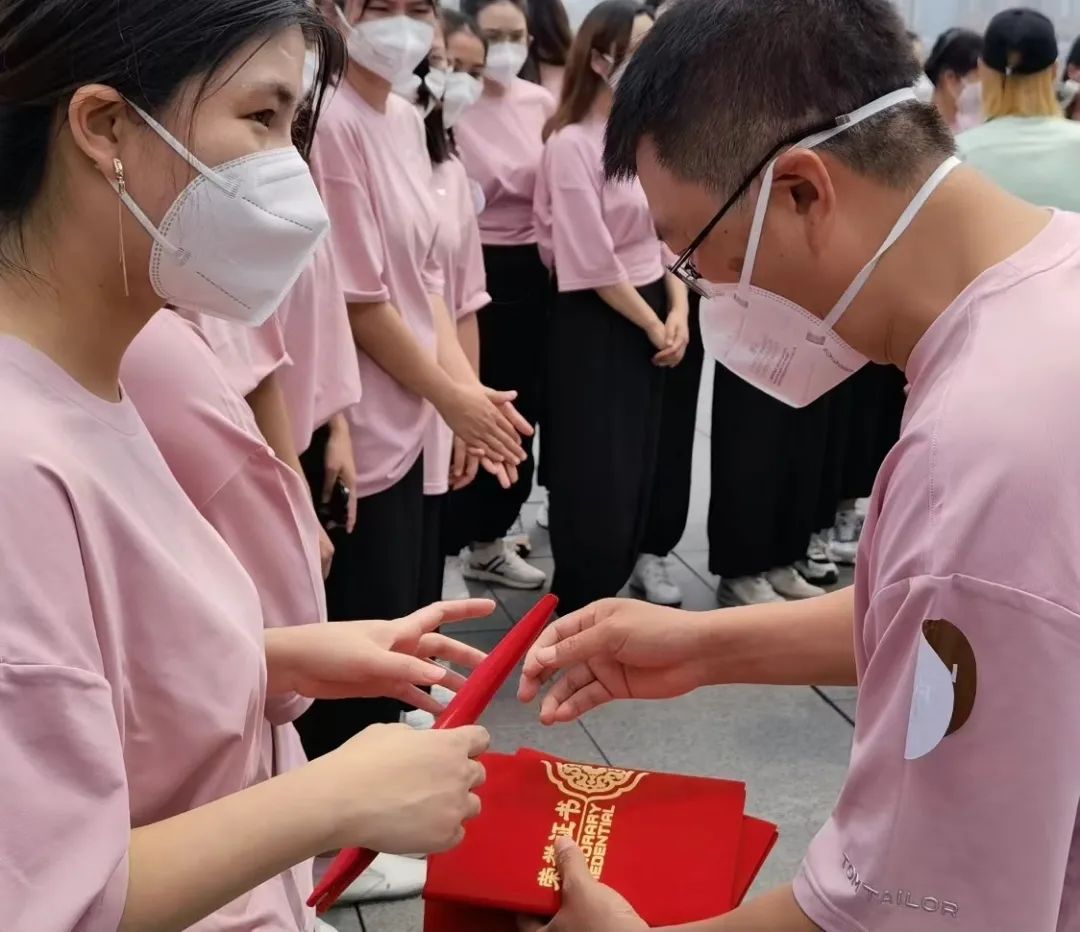 逛完外滩,易嘉丽和小伙伴们一起前往了“网红打卡点”——复鑫艺术中心。当拐至露台时,队员们惊喜地发现了早已等候着她们的复鑫同事们。“花都开好了,我们爱上海——复鑫医疗队圆满完成援沪任务”,一个大蛋糕被缓缓推上前来。随后,复鑫抗疫指挥部为她们分别送上经典的上海牌定制手表,作为此次援沪行动的特殊纪念,表盘背面刻有“携手抗疫 守沪同心”八个字,并附队员姓名及手表编号和日期。