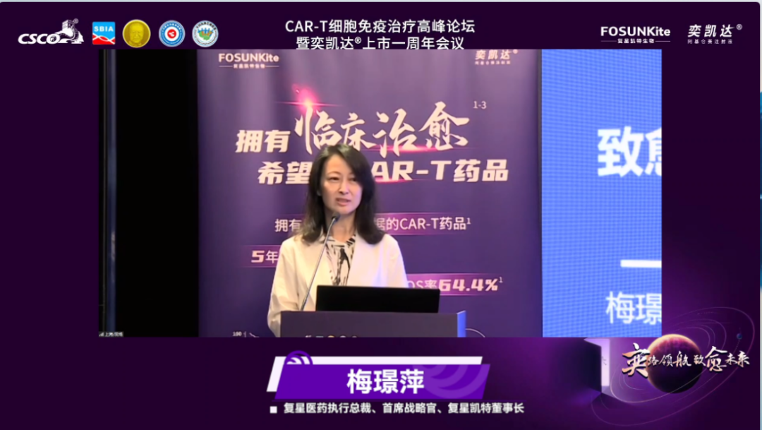会议首先由复鑫医药执行总裁、首席战略官、复鑫凯特董事长梅璟萍女士致辞,她表示:“阿基仑赛注射液是全球首个拥有5年长期生存数据的CAR-T产品,意味着临床治愈时代已经到来。阿基仑赛注射液还是首个获得FDA批准用于二线LBCL的CAR-T细胞产品。如今,包括中国在内的全球细胞治疗产业正快速发展,在此背景下,阿基仑赛注射液在国内的一周年仅仅是一个开始,未来复鑫凯特将继续致力于肿瘤治愈,持续推动细胞治疗可及,为患者提供更优的治疗方案。”