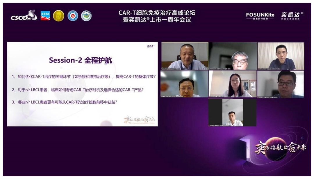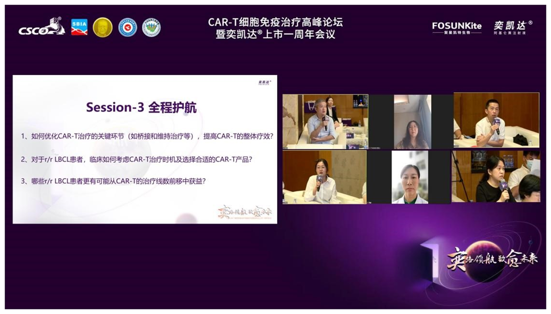 讨论环节由复旦大学附属中山医院刘澎教授主持,上海交通大学医学院附属瑞金医院吴文教授、江苏省人民医院徐卫教授、复旦大学附属肿瘤医院曹军宁教授、华中科技大学同济医学院附属同济医院肖毅教授、上海市同济医院李萍教授同Prof. YiLin、王黎教授针对CAR-T临床治愈证据与LBCL治疗目标策略展开讨论。