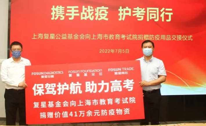 2022年上海市秋季高考于7月7日-9日举行。从上海市教育委员会得知上海市教育考试院相关抗疫物资需求后,复鑫基金会理事长李海峰表示,“助力上海高考,复鑫基金会责无旁贷。我们尽己所能多做一些,希望能够帮助孩子们顺利完成高考。”