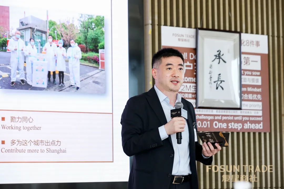 他表示,“道生一”,复鑫商社诞生于2020年新冠疫情全球暴发之时,脱胎于复鑫新冠肺炎抗疫全球战时指挥部,其“助天下”使命与生俱来;“一生二”是坚守客户至上和交易第一,时刻提醒复鑫商社“持续珍惜客户的信任,持续为客户创造价值”;“二生三”要求商社发挥独有的“复鑫生态、抗疫品牌、资金实力、专业高效、创新驱动”五大优势,全方位与国内外企业和机构平等合作,希望客户、合作伙伴与复鑫商社共同碰撞更具爆发性的新模式,创造更大价值;“三生万物”则指出,复鑫商社已经拥有一支“充满激情、谦逊好学、全球视野、善打硬仗、专业高效”的年轻团队,这个团队与各块专业领军人物才是复鑫商社最为核心的资产,也是复鑫商社走向三生万物的基石和保障,除此之外,还非常需要外部伙伴的充分信任,让我们一起坚定携手,共同承长。