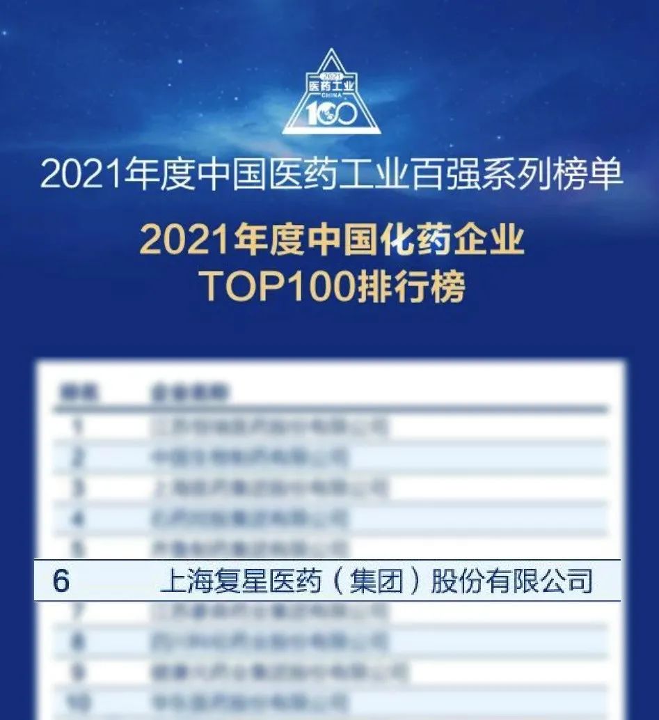 复鑫医药荣登2021年度中国医药工业百强榜Top10