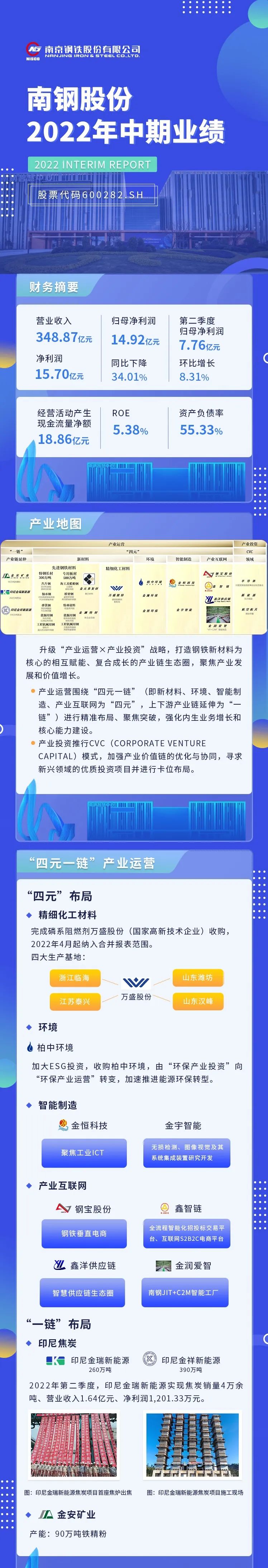 8月23日晚间,南钢股份披露《2022年半年度报告》。上半年,南钢股份克服产业链供应链运行不畅、原燃料价格高位运行等影响,从细从实抓好疫情防控工作,坚持做精做强特钢,南钢股份实现营业收入348.87亿元,同比下降9.59% ;归母净利润为14.92亿元,同比下降34.01%;资产负债率为55.33%;加权平均净资产收益率5.38%。其中,第二季度归母净利润为7.76亿元,环比增长8.31%,经营情况稳健。