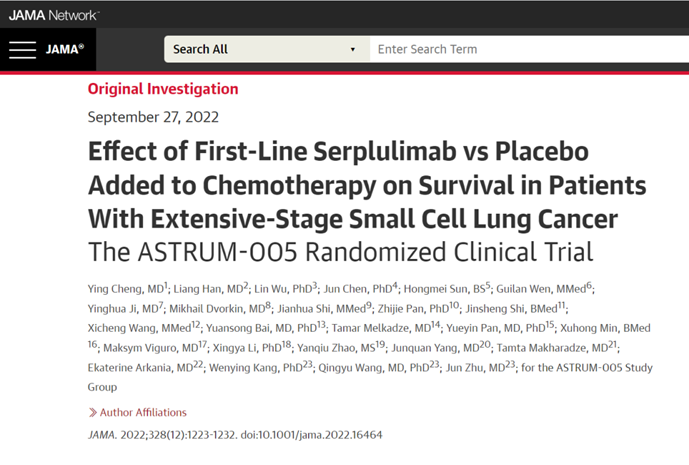 9月27日,由程颖教授牵头的国际多中心研究——ASTRUM-005研究在全球四大顶级医学期刊之一的《美国医学会杂志》(JAMA,影响因子:157.3)在线发表,成为全球首个登上JAMA主刊的小细胞肺癌免疫治疗临床研究。
