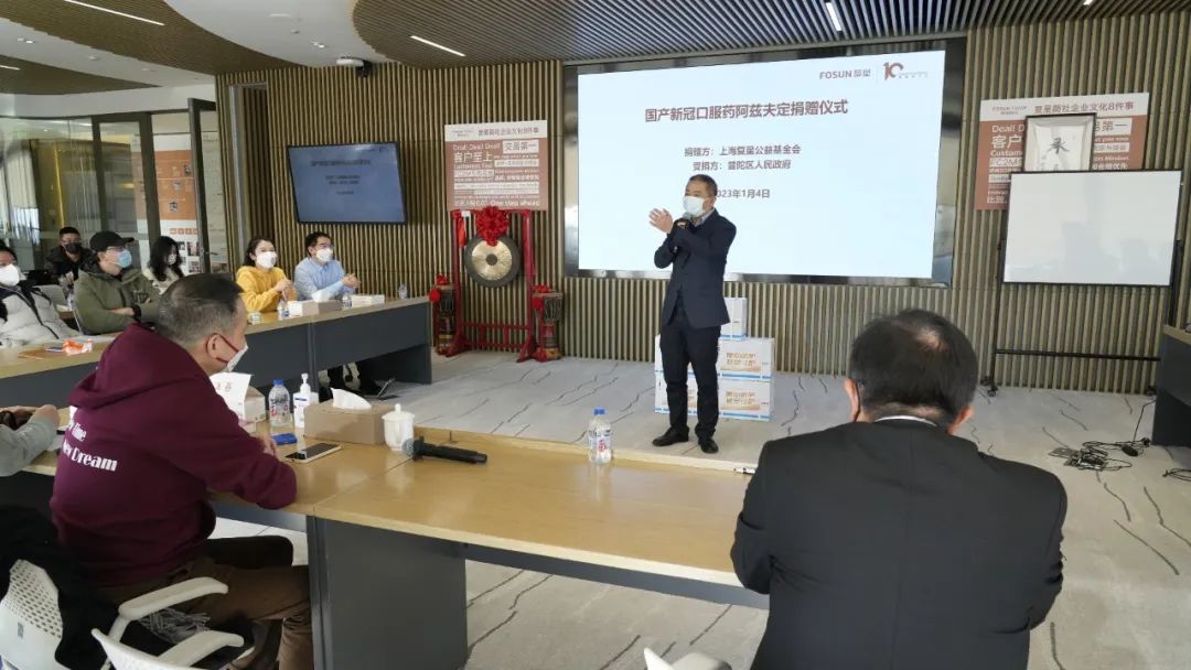 捐赠仪式在复鑫抗疫全球战时指挥部举行。普陀区合作交流办主任唐建辉表示,昭通是普陀区对口支援的城市,此次他们对药品有需求,我们第一时间联系了复鑫基金会。感谢复鑫一直以来对上海及云南地区抗疫物资的支援,“我们会亲自把这批阿兹夫定片送往昭通,用于病人救治。”
