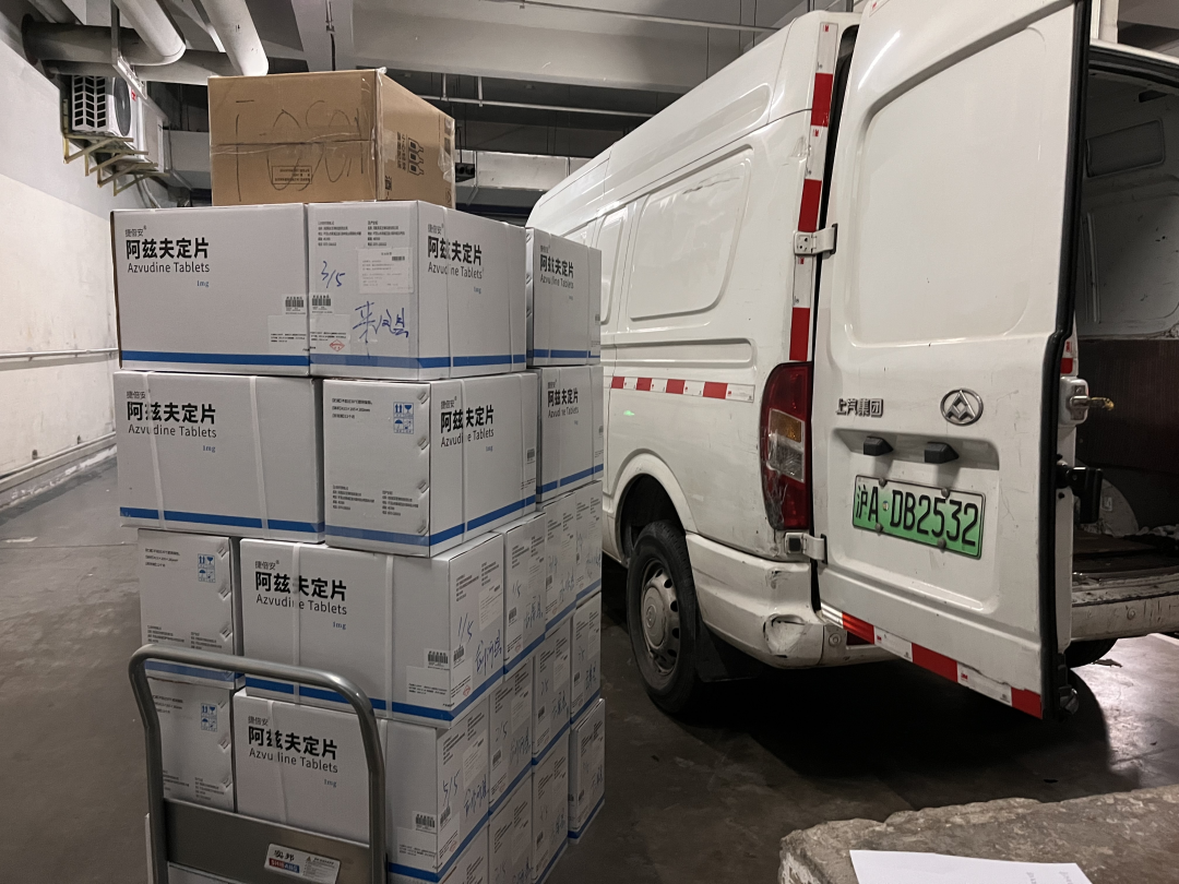 “复鑫阿兹夫定捐赠专项战役小组”紧急对其进行物资匹配及筹措。1月25日,年初四,复鑫基金会助理秘书长郭帅早早来到办公室,对阿兹夫定进行核对、分类、拆箱、登记追溯码,然后再将物资搬上推车。早上十点,6200瓶阿兹夫定完成出库。