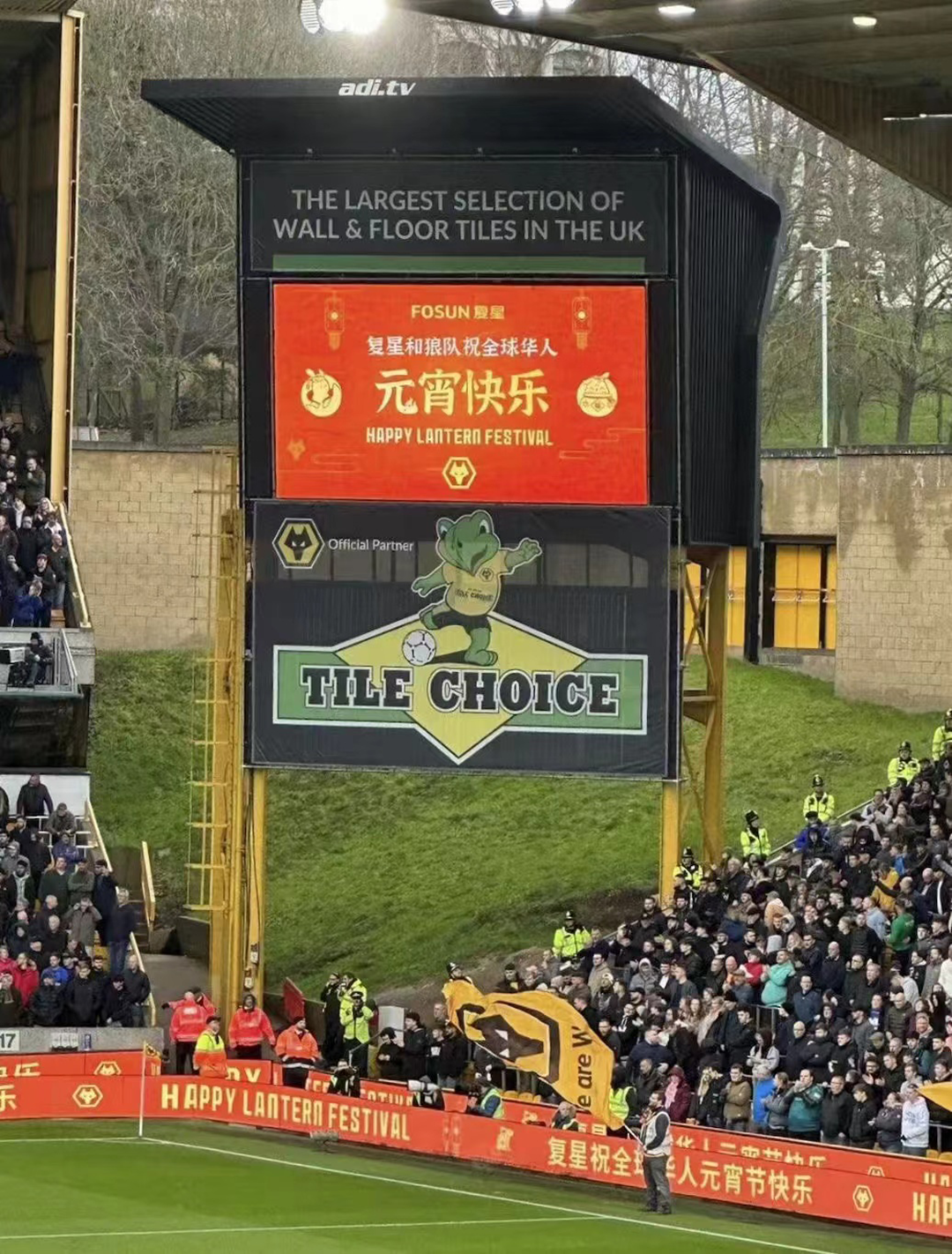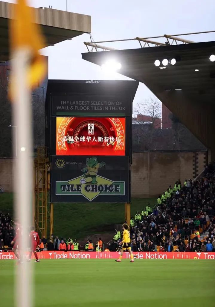 北京时间2月4日23时,英格兰伍尔弗汉普顿市,莫利纽足球场,11名球童手持火遍全网的豫园新春灯会“兔子灯”,和身着印有“元宵快乐”祝福语出场服的英超狼队球员,一起昂首走向球场中央。旋即,“复鑫和狼队祝全球华人元宵节快乐”巨型横幅缓缓展开,主场焰火点燃,LED大屏闪烁,新春闹元宵的喜庆氛围在全场弥漫开来。