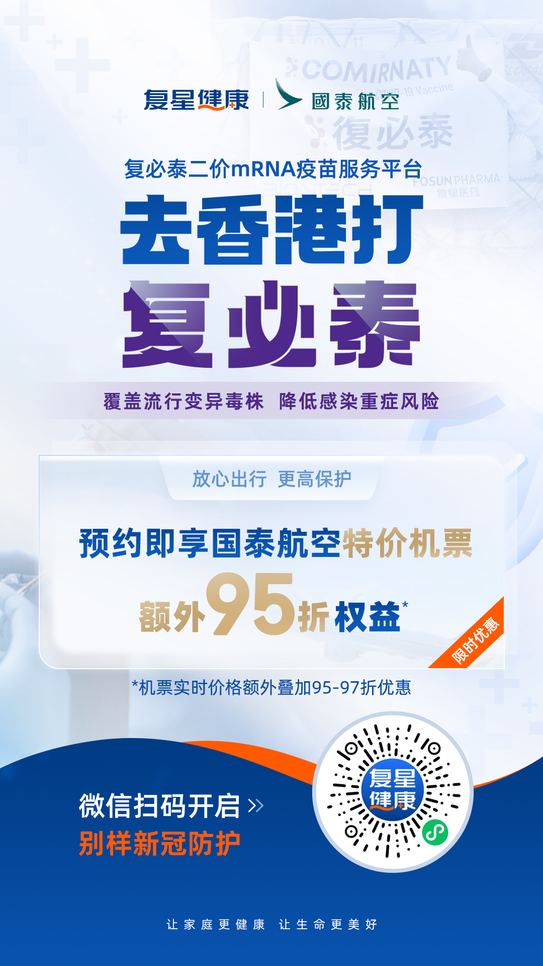 3月13日,复鑫健康联合国泰航空推出预约赴港接种复必泰疫苗,将同时享有国泰航空95折上折,这是赴港接种复必泰二价mRNA疫苗旅游新思路的又一利好。国际著名医学期刊《柳叶刀》2021年6月25日的一篇研究表明,异源疫苗接种方案会显著提高特异性抗体。这意味着已经打过1-3针灭活疫苗的内地居民,如果加强针选择接种mRNA疫苗,尤其是覆盖奥密克戎变异株的二价mRNA疫苗,将获得更好的保护力。