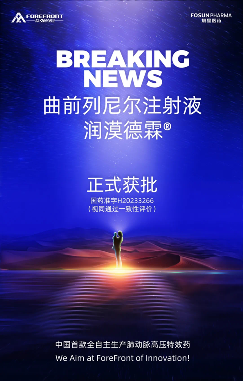 3月16日,复鑫医药独家商业化的肠外前列环素类似物:曲前列尼尔注射液(商品名:润漠德霖®)获国药监批准。肠外前列环素类似物是国内外指南的重点推荐,用于治疗肺动脉高压,以减轻劳累诱发的呼吸困难、胸闷、胸痛、晕厥、干咳、恶心、呕吐等进行性右心功能不全症状。曲前列尼尔注射液的获批,为肺动脉高压患者带来新选择,帮助中危至高危患者缓解症状,延长寿命。