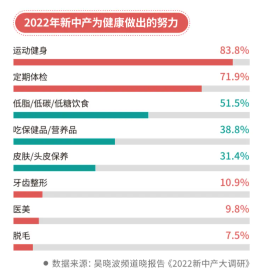 吴晓波频道《2022新中产白皮书》中用“微养生”非常贴切地描述了新中产的健康管理——通过改善生活方式和饮食习惯,加强运动等措施使得在疾病形成之前进行有针对性的预防干预。