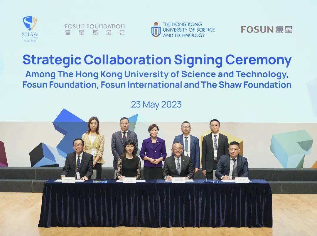 复鑫国际总裁助理、香港、澳门执行首代罗紫君,复地产发香港公司总裁袁健宇,邵氏基金会主席陈伟文和香港科技大学副校长郑光廷在港科大逸夫演艺中心共同签署了此次战略合作协议。香港科技大学校长叶玉如,复鑫国际执行总裁、复鑫蜂巢董事长王基平,复鑫基金会理事长李海峰,复鑫创富轮值董事长徐欣,复地产发集团CEO张智聪等,共同见证了此次签约。
