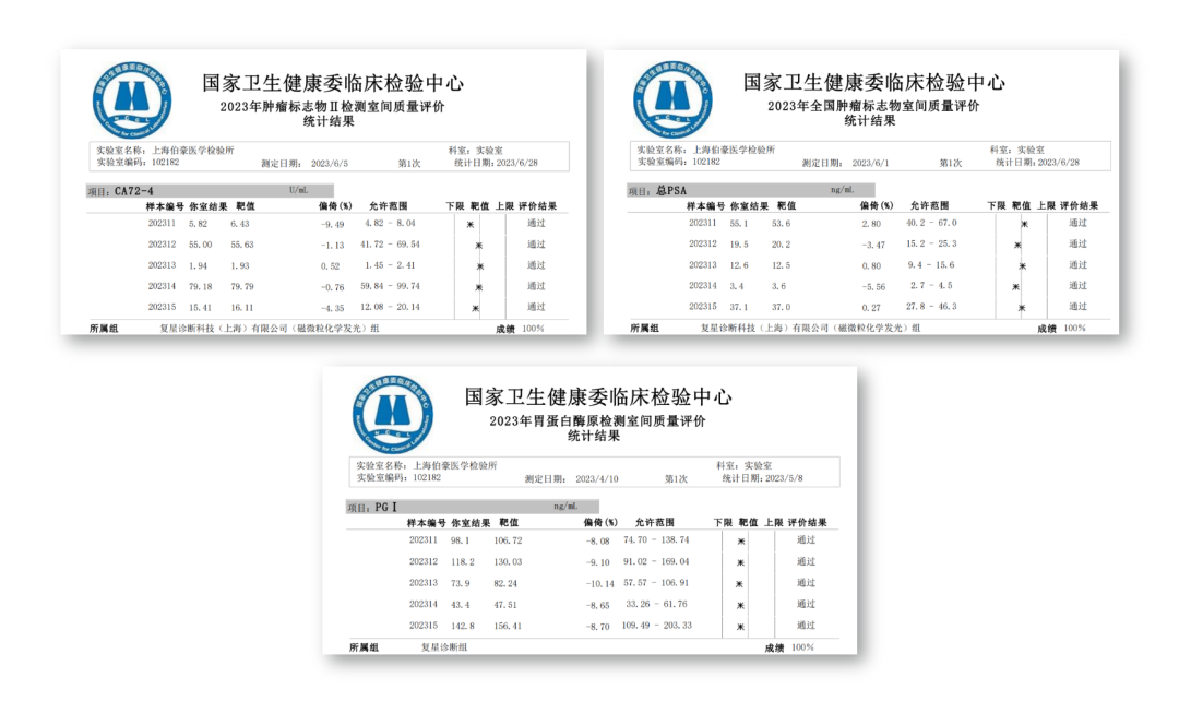 近日,复鑫诊断化学发光肿瘤标志物系列检测产品(肿瘤标志物/肿瘤标志物Ⅱ/胃蛋白酶原)参加国家卫生健康委临床检验中心室间质评,均以满分的成绩通过,彰显出复鑫诊断系列产品高度稳定、安全可靠的优势特点。