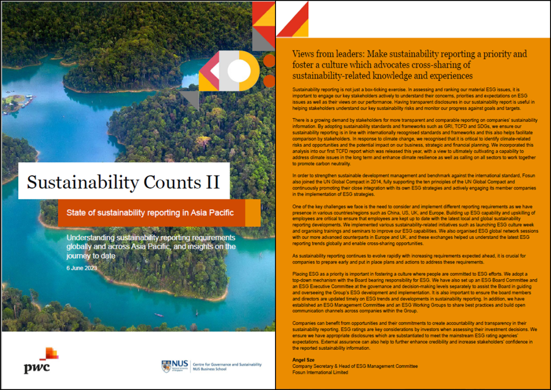 2023年7月12日,新加坡国立大学(NUS)商学院治理与永续发展研究所(CGS)与普华永道新加坡(PwC)近日共同发布了《可持续发展的重要性(第二版)研究报告》(Sustainability Counts II)。依据全球报告倡议组织(GRI)和气候相关财务披露工作组(TCFD)的原则,该调研重点分析了亚太地区14个国家和地区按市值排名前50家上市企业在2021年和2022年发布的可持续发展报告属性,其中涉及11个行业共700家上市公司。复鑫国际有限公司(香港联交所股份代号:00656,简称“复鑫国际” 或“复鑫”)是其中一家被调研的香港上市公司。报告分享了复鑫国际积极应对ESG披露挑战,在ESG披露、推动可持续发展及企业责任上的管理案例。