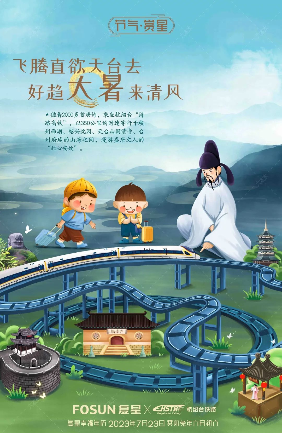 本期《节气·赏星》海报就描绘了一辆复兴号列车飞驰在杭绍台铁路上,穿行于杭州雷峰塔、绍兴沈园、新昌天姥山、天台国清寺、台州府城等山海之间,漫游盛唐文人“此心安处”的画面。