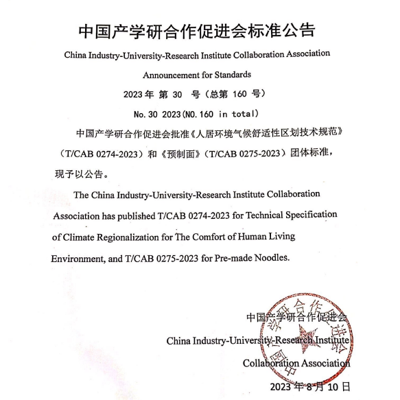 近日,由豫园文化饮食集团科创中心携手中国标准化研究院等研究测试机构及多家食品单位共同编制,中国产学研合作促进会公布实施的国内首个预制面行业团体标准《预制面》(T/CAB 0275-2023)正式发布,自公布之日起开始实施。该团标对预制面的术语定义、产品分类、包装储存等提出了质量安全管控标准指南,让餐饮企业有标准可依、有标准可循,助推相关生产企业在加快预制产品研发创新的同时,提升产品品质和消费体验,从而推动整个预制菜市场的良性发展。