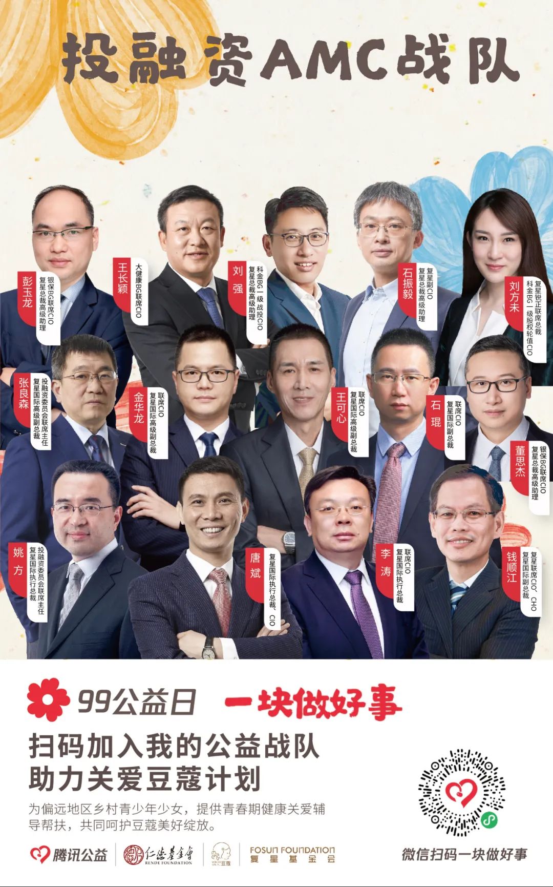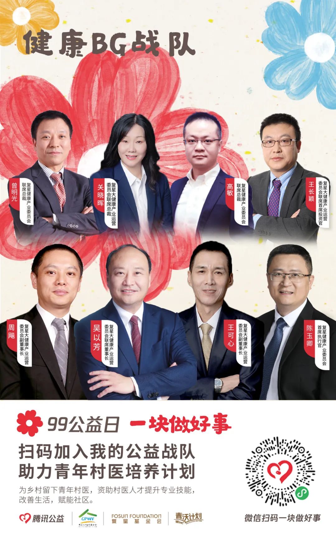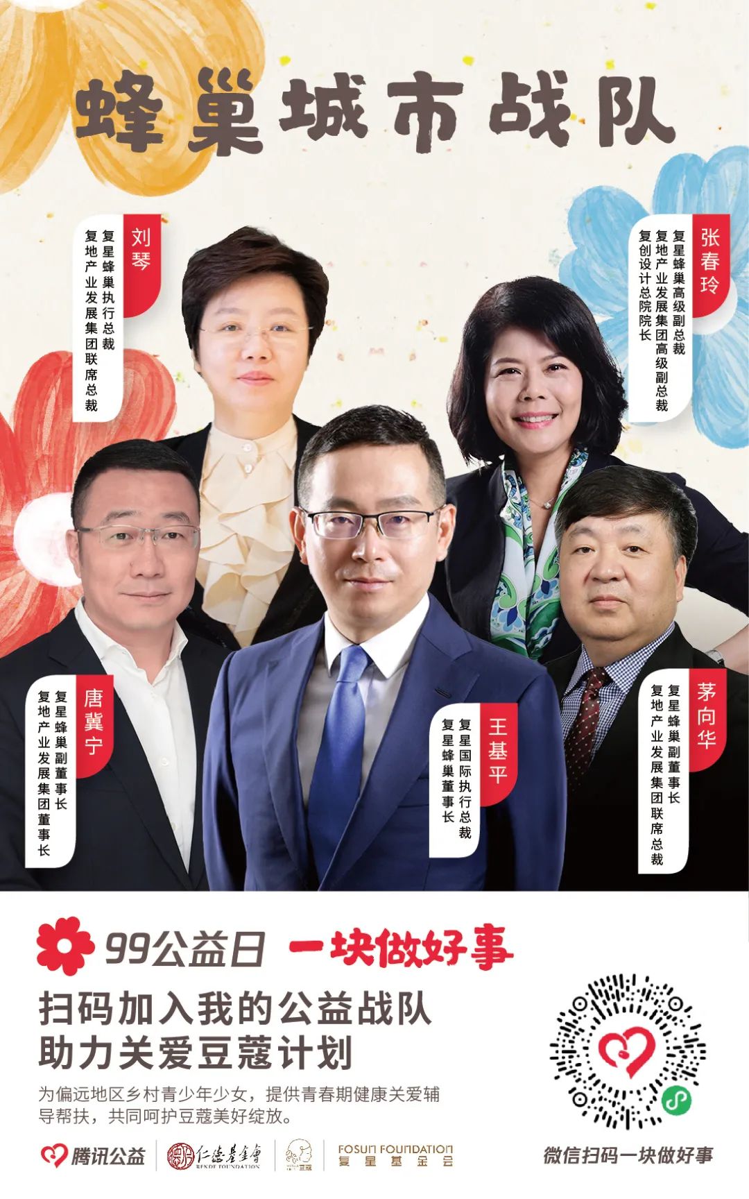 由【集团本部战队】【大健康战队】【大快乐战队】【大富足战队】【大智造战队】【蜂巢战队】六大一级战队裂变而出20支二级战队,将发动复鑫一家全体力量,通过与中国人口福利基金会、上海仁德基金会两家公募基金会合作,为今年99公益日筹款项目进行募捐。