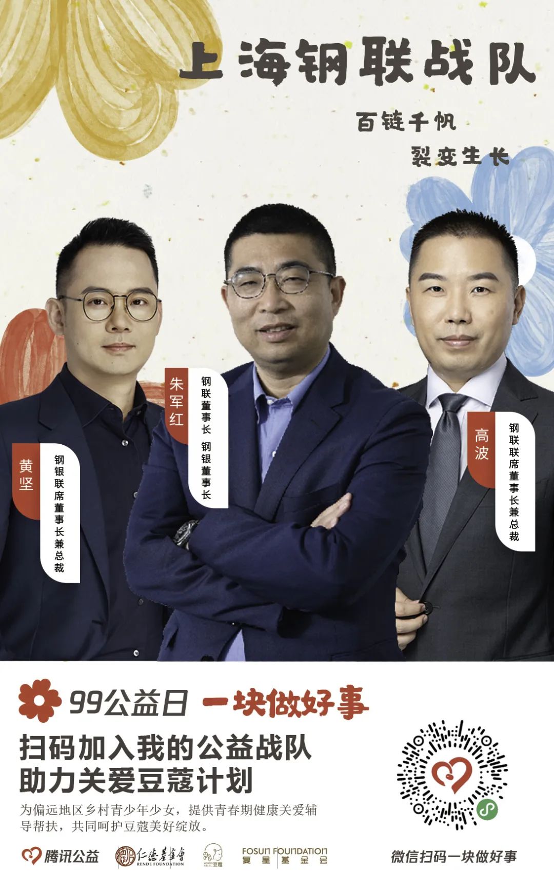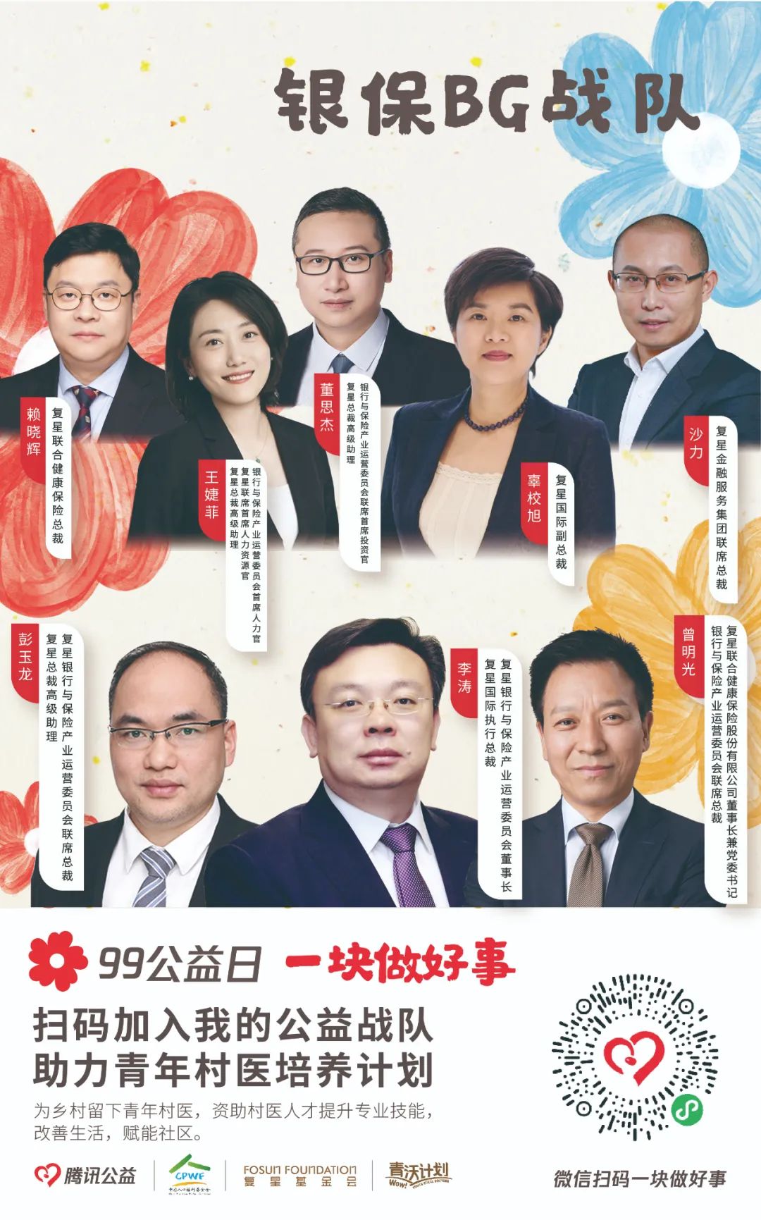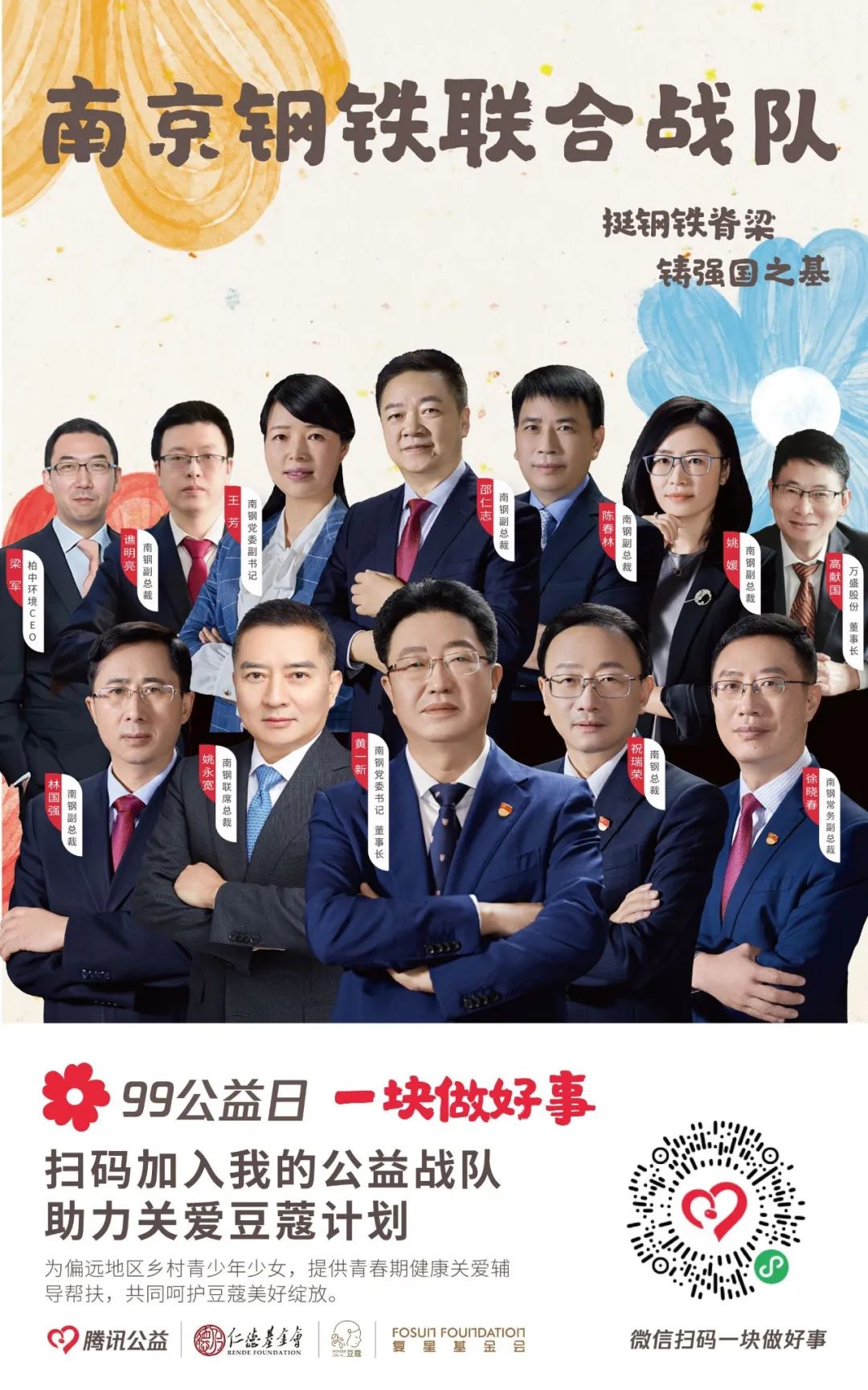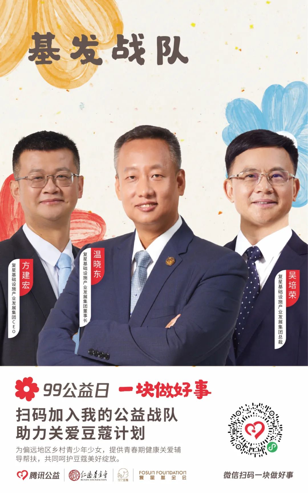 由【集团本部战队】【大健康战队】【大快乐战队】【大富足战队】【大智造战队】【蜂巢战队】六大一级战队裂变而出20支二级战队,将发动复鑫一家全体力量,通过与中国人口福利基金会、上海仁德基金会两家公募基金会合作,为今年99公益日筹款项目进行募捐。