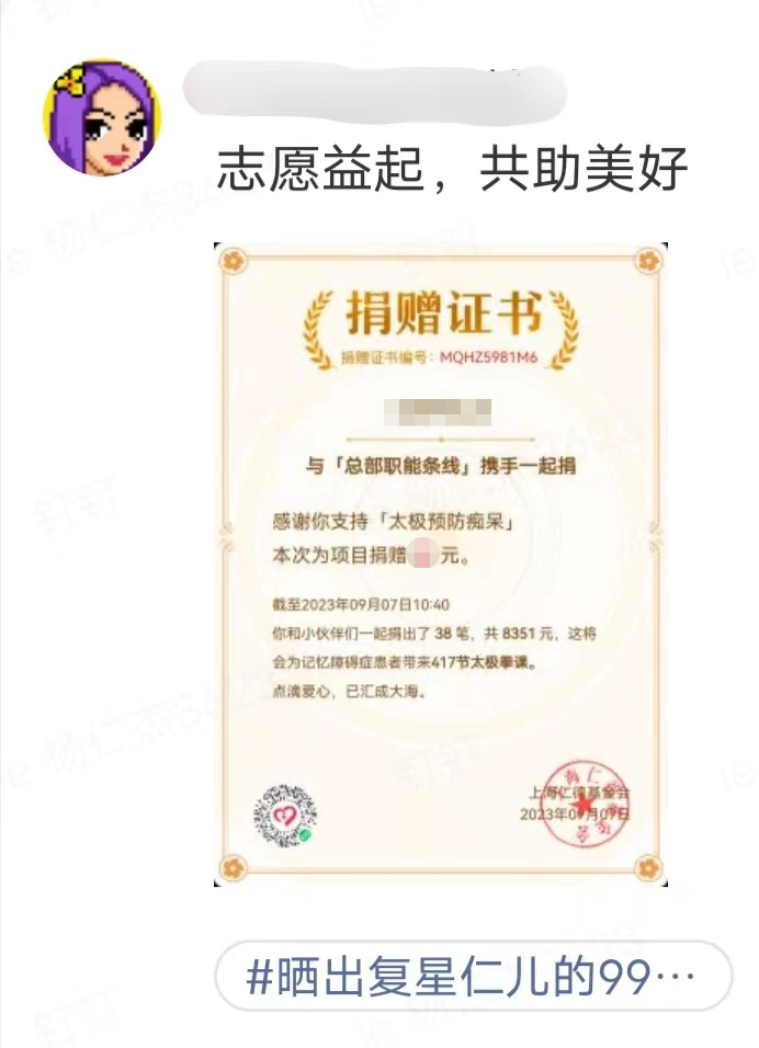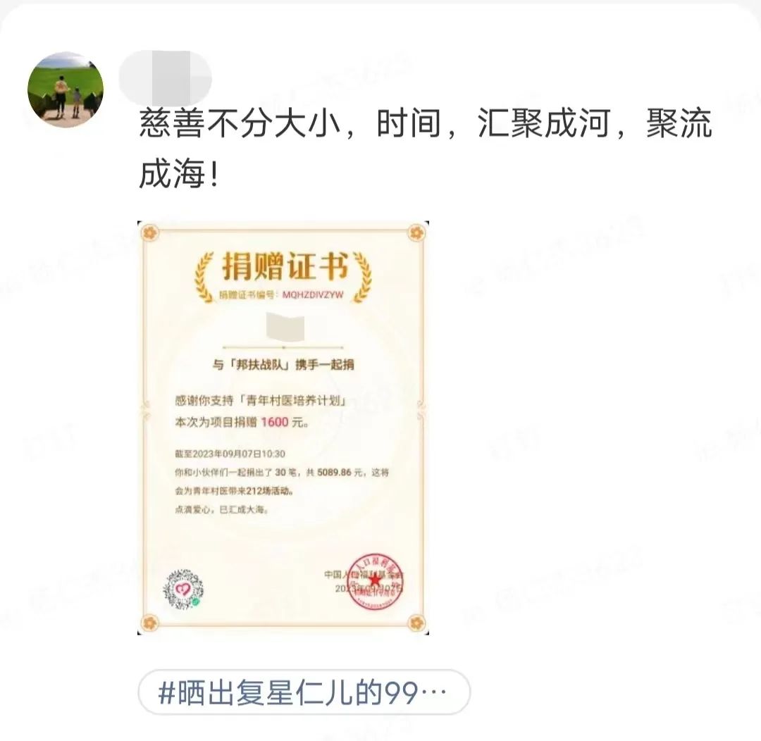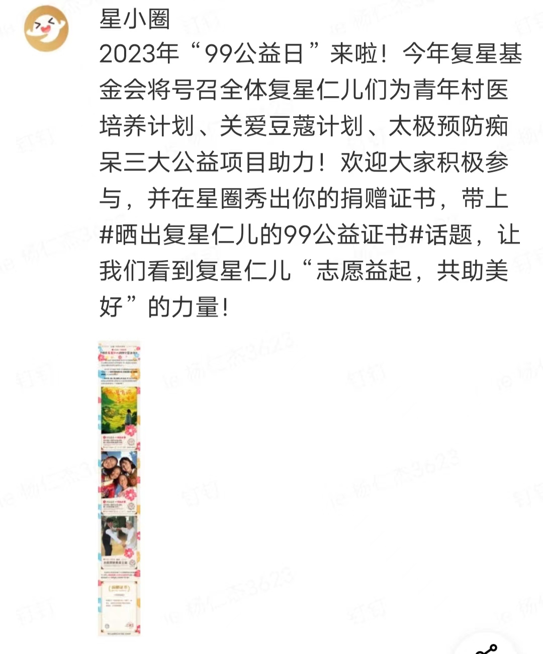 ● 上海复鑫公益基金会(下称“复鑫基金会”)、星益家、六星计划、星圈联合发起#晒出复鑫仁儿的99公益证书#活动: