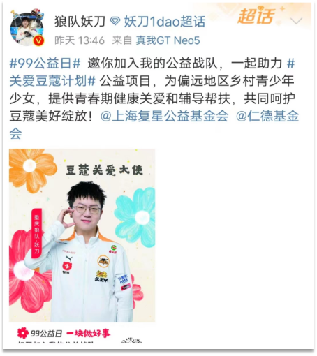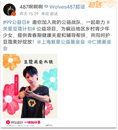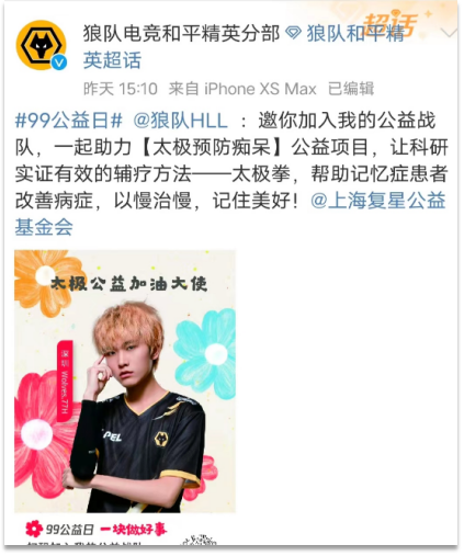 林更新、张天爱、重庆狼队FLY、重庆狼队·妖刀、成都Wolves.487、深圳Wolves 77H,为青沃计划(青年村医培养计划)、关爱豆蔻计划、太极预防痴呆3大公益项目助力Call!在“乡村医生守护者”、“豆蔻关爱大使”、“太极公益加油大使”们的公益倡导下,99期间项目相关的图文、视频在微博、公众号、腾讯公益等平台,传播量超246万次。