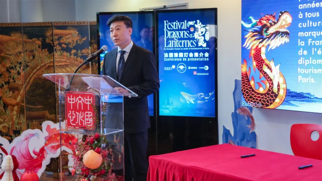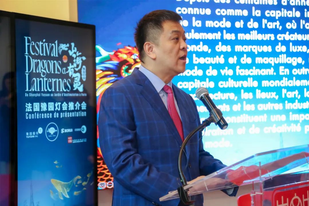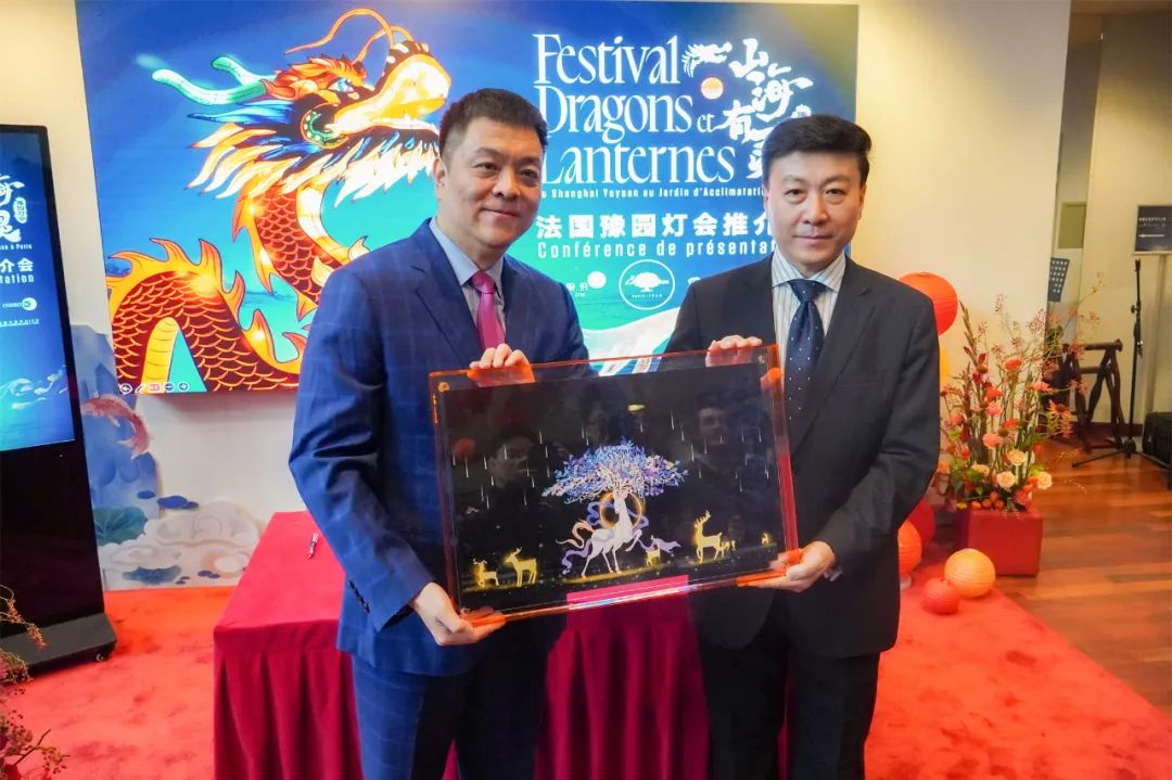 这次灯会主题为“山海有灵”,以成书于2000多年前的中国古代百科全书《山海经》为设计蓝本,以2024年的生肖“龙”和《山海经》中各种充满神秘感和想象力的“神兽”为“主角”,将中国传统灯彩制作技艺与现代新媒体灯光技术结合,并辅以丰富多彩的民俗和演艺活动,为法国人民带来一场充满东方美学色彩又欢乐趣味的新春游园盛会。尤为值得一提的是,2024年是中法建交60周年,而在法国巴黎的豫园灯会亮灯后不久,中国上海的豫园灯会也将随之点亮,并在灯会举办期间双城联动,共同为中法两国友谊献礼,并为即将于2024年7月开幕的巴黎奥运会送上祝福。中国驻法大使馆文化处公使衔参赞严振全,巴黎中国文化中心主任刘红革,豫园股份总裁(轮值)胡庭洲,巴黎风情园园长、路威酩轩集团秘书长Marc-Antoine Jamet,巴黎七区第一副区长高德(Josiane GAUDE)等中法两国相关政府机构、媒体代表、合作客户等领导和嘉宾参加推介会。