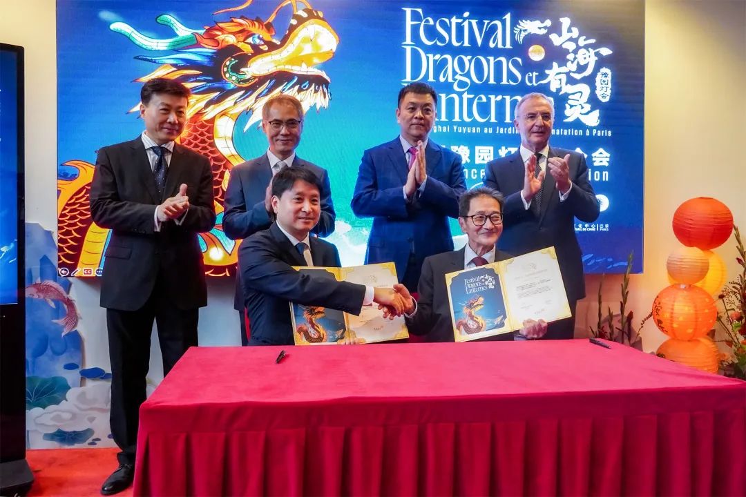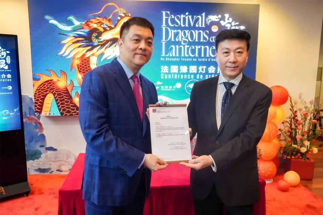 此外,豫园股份与巴黎中国文化中心也当场签署了捐赠协议,本次法国豫园灯会结束后,“白鹿”灯组将留存在巴黎中国文化中心之内,继续传递中法两国的深厚情谊。巴黎中国文化中心于2002年11月29 日在巴黎塞纳河左岸孟德斯鸠公馆正式成立,这是中国在欧洲国家设立的第一个文化中心。巴黎中国文化中心主任刘红革感谢豫园股份将法国豫园灯会的灯组捐赠给巴黎中国文化中心,这将成为塞纳河边中国彩灯的精彩延续。灯会正式开展期间,巴黎中国文化中心也将作为法国公众探索中国传统节庆文化以及相关非物质文化遗产的窗口,与灯会交相辉映,豫园股份将组织丰富多彩的文化活动,与各位携手为法国公众奉献一场场中国文化盛会。△左图为豫园股份向巴黎中国文化中心捐赠“白鹿”灯组,右图为巴黎中国文化中心回赠豫园股份捐赠证书