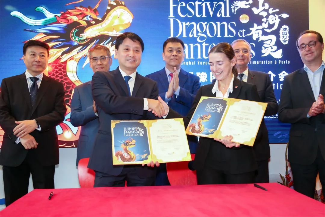 9月26日的推介会上上海豫园与巴黎风情园将成为中法两国市民文化交流、友好交流的一个桥梁,推动未来上海和巴黎的深层合作。同时,豫园股份还与童趣出版社和友丰出版社进行了《山海奇豫记》中法文儿童读本的签约。该系列读本将豫园灯会的美好回忆留存于书本上,用卡通绘本的形式讲述《山海经》的故事,让更多外国孩童可以领略到中华传统文化的魅力,让充满神奇的山海之旅进一步走向世界。△上图为豫园股份与友丰出版社进行《山海奇豫记》法文儿童读本签约,下图为豫园股份与童趣出版社进行《山海奇豫记》中文儿童读本签约