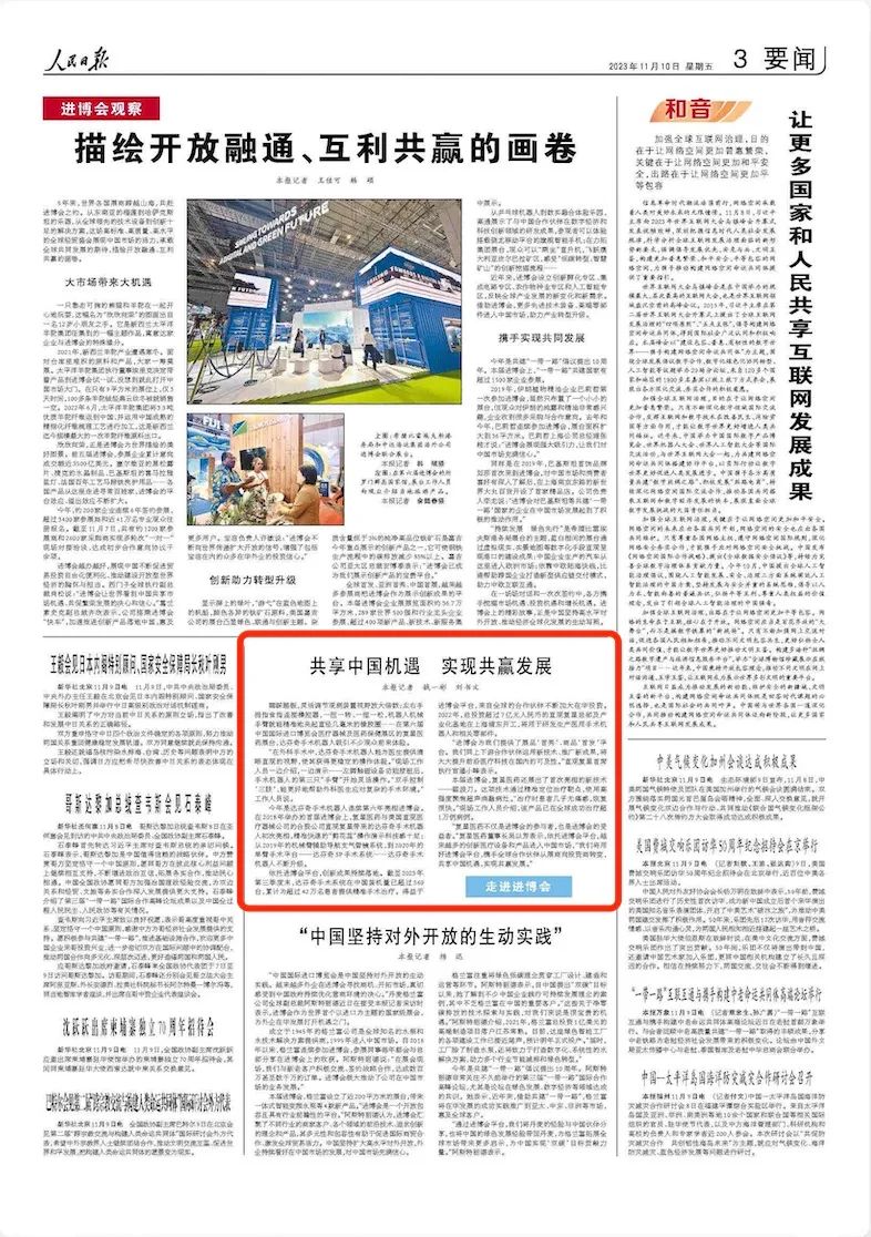 11月10日出版的人民日报第3版,以《共享中国机遇 实现共赢发展》为题报道达芬奇手术机器人等复鑫展台明星展品