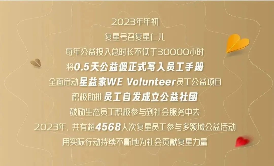 回顾2023年度复鑫员工公益时刻,共有超4568人次复鑫员工参与多领域公益活动,用实际行动持续不断地为社会贡献复鑫力量。据统计,复鑫海内外员工公益总时长为34476小时。
