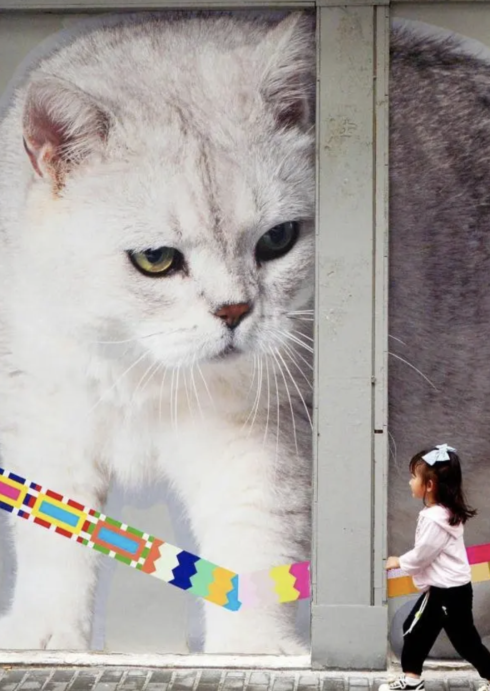 5月6日,一位小游客走过外滩猫街上的巨幅猫咪墙绘前,仿若引起了大猫的好奇。外滩猫街是2023外滩艺术季的超人气打卡点,为周边豫园商城、BFC外滩金融中心日均引入客流近10万,同比2021年增长30%。