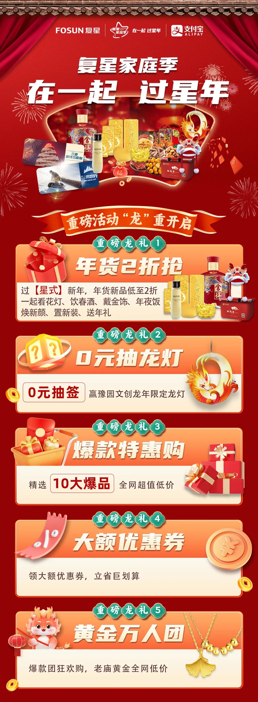 1月3日,复鑫家庭季专题会场在支付宝上线,整合复鑫旗下老庙、大豫园、餐饮、酒水、旅文等产业和字号,通过“看花灯”“饮春酒”“戴金饰”“吃年饭”“置新装”“焕新颜”“送好礼”七大年俗场景,分阶段举办各种龙年新品、爆品、稀缺福利等用户权益活动,提供一站式家庭消费年货好礼专场。值得一提的是,各类品牌的龙年新品也将陆续在直播间与消费者见面。去年12月16日,老庙邀请中国香港堪舆学专家麦玲玲,在支付宝直播间全网首发“老庙x麦玲玲”龙年新品系列,直播销售额破千万。