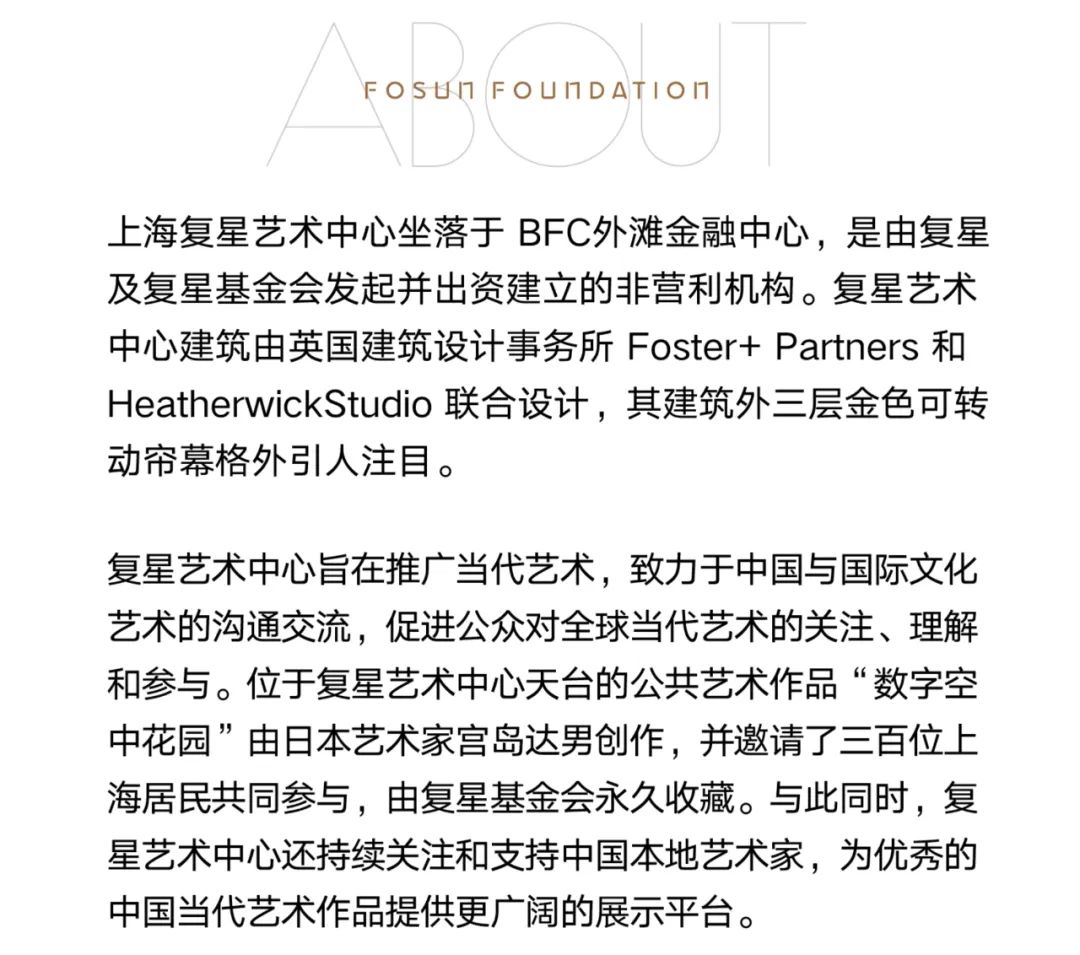 复鑫艺术中心是由复鑫及复鑫基金会发起并出资建立的非营利机构。