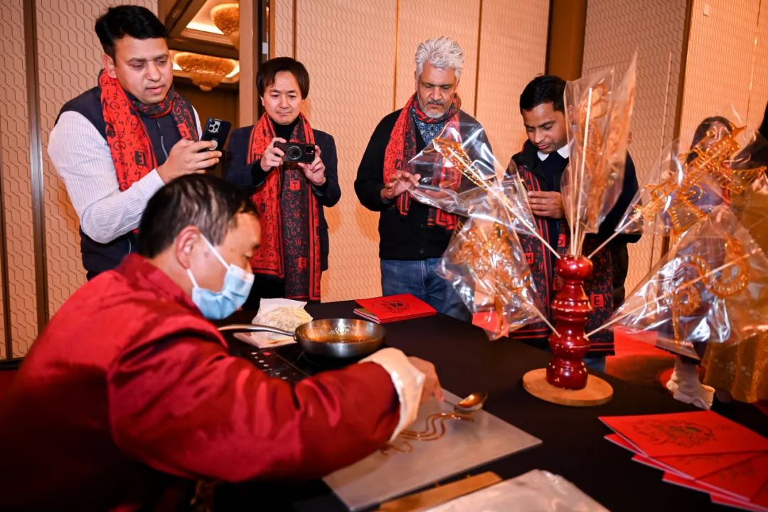 随后,国际友人们还体验了香囊、剪纸、书法、糖画等传统非遗技艺。拥有240年历史的童涵春堂,臻选道地药材,研磨后装入香囊,日常佩戴既有好的寓意,也能起到一定的保健养身效果;一张红纸,一把剪刀,剪刻出各种寓意吉祥、祝福的图案,是逢年过节必备的装饰;春联、福字,同是过年装饰,却是通过笔墨,红纸黑字,写出吉祥如意;拨动转盘,指针所示的图案,即刻呈现,糖画既是美食也是艺术。