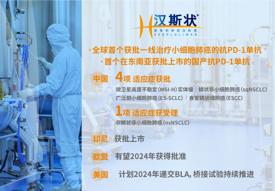 报告期内,复鑫医药自主研发的首款生物创新药汉斯状于中国境内新增获批广泛期小细胞肺癌(ES-SCLC)及食管鳞状细胞癌(ESCC)两项适应症,成为全球首个获批用于一线治疗广泛期小细胞肺癌(ES-SCLC)的靶向PD-1单抗药品。目前,汉斯状于中国境内已获批4项适应症,上市迄今已惠及6万余名中国患者。此外,斯鲁利单抗注射液亦已获印度尼西亚食品药品监督管理局(BPOM)批准用于治疗广泛期小细胞肺癌(ES-SCLC),系该产品首次于海外市场获批上市,也是首个在东南亚国家获批上市的国产PD-1单抗。