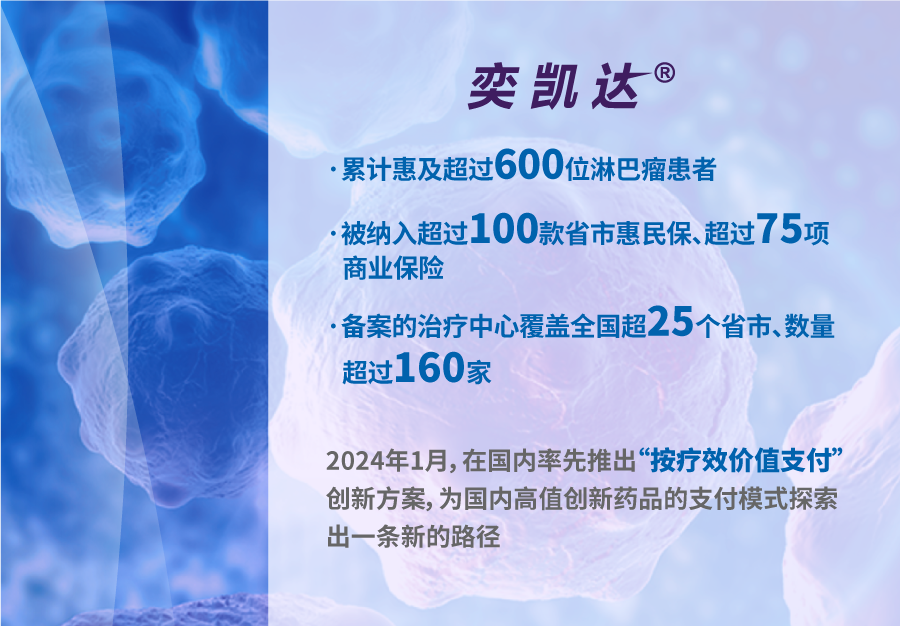 合营公司复鑫凯特在国内上市的第一款 CAR-T细胞治疗产品奕凯达(阿基仑赛注射液)于2023年6月于中国境内新增获批二线适应症,惠及更多一线免疫化疗无效或复发患者。截至报告期末,奕凯达已累计惠及超过600位淋巴瘤患者,被纳入超过100款省市惠民保和超过75项商业保险,备案的治疗中心覆盖全国超25个省市、数量超过160家。2024年1月,奕凯达在国内率先推出按疗效价值支付的创新方案,为国内高值创新药品的支付模式探索出一条新的路径。