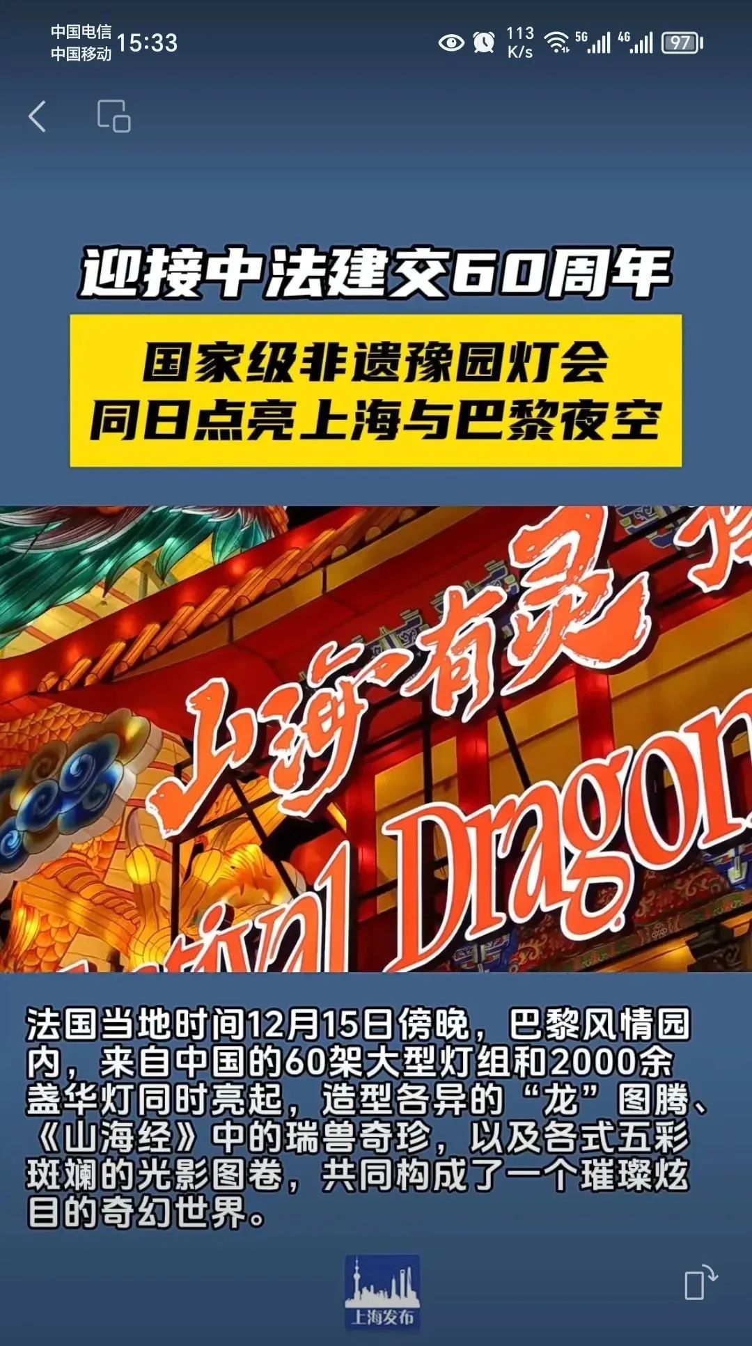 2023年兔年元宵节前,51个国家80多位驻沪领事、参赞齐聚豫园赏灯,亲身体验了中国优秀传统文化盛宴;2024年灯会举办时,又有30多家我国驻外使领馆账号,在海外社媒平台上推荐“山海奇豫记”的美妙瑰丽;在中法建交60周年之际,豫园灯会实现文化出海首站落地巴黎,大龙灯成功点亮LV基金会所在的巴黎风情园,实现了法国巴黎、中国上海“双园双城联动”,并获得市委宣传部颁发的2023年上海市“银鸽奖”最佳活动案例。