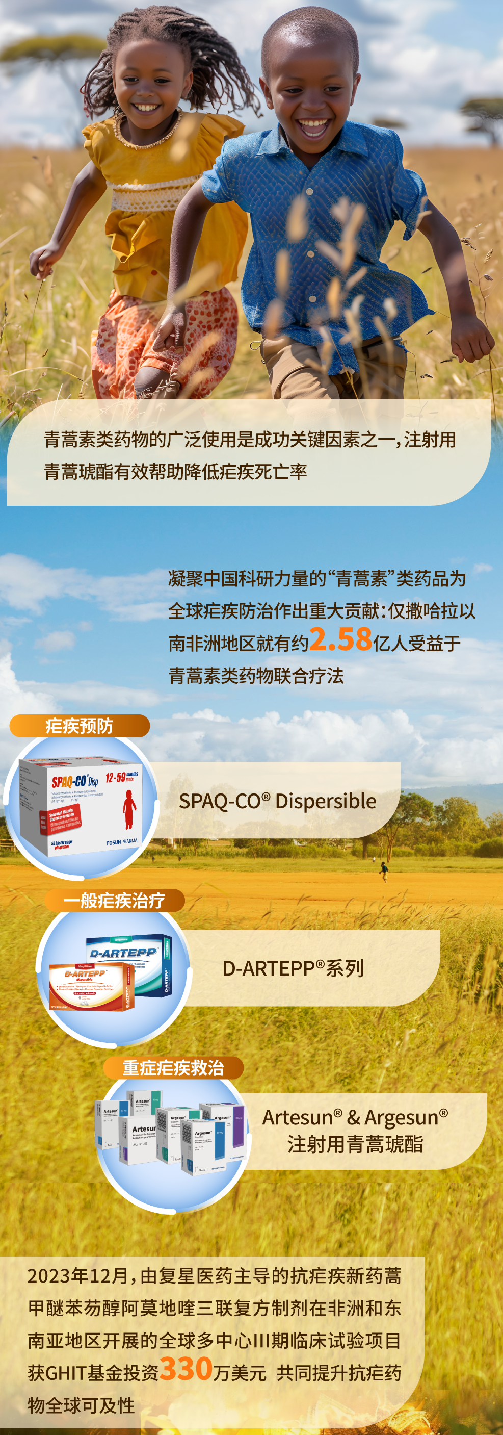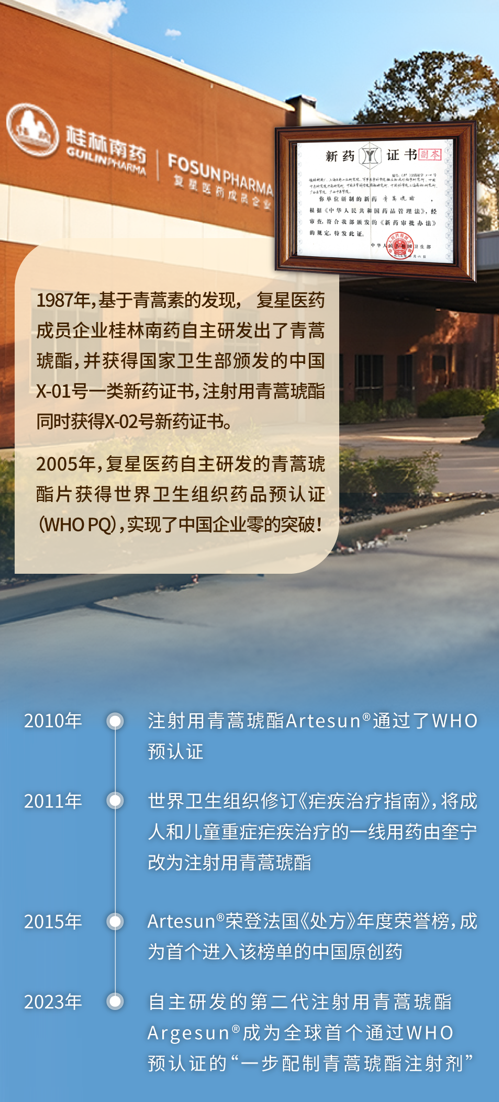 2010年,复鑫医药自主研发生产的注射用青蒿琥酯Artesun®通过WHO药品预认证,2011年至今,一直是世界卫生组织推荐的作为儿童和成人重症疟疾治疗的一线药物。同时,复鑫医药也是全球基金、联合国儿童基金会、世界卫生组织及非洲各国政府的抗疟疾药品供应商。截至2023年末,复鑫医药已累计向全球市场供应超3.4亿支注射用青蒿琥酯,注射用青蒿琥酯已累计救治了全球超6,800万重症疟疾患者。