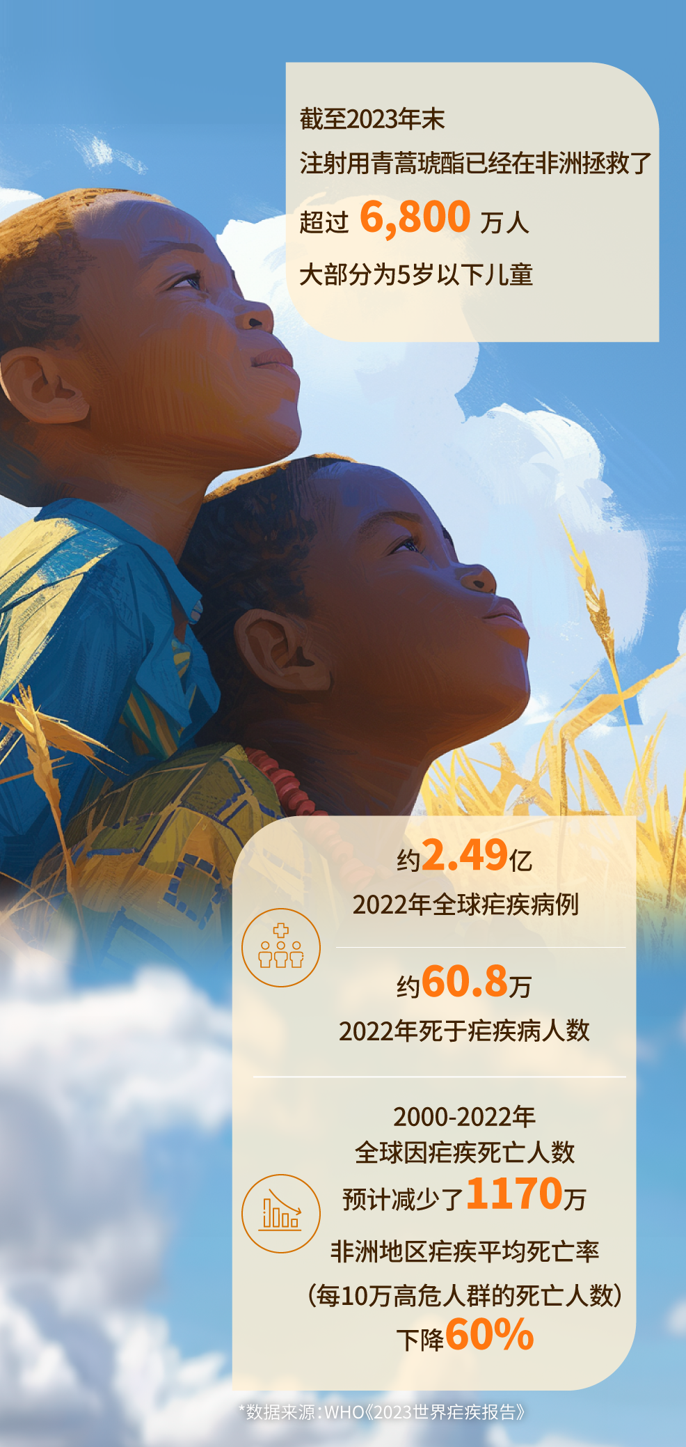 凝聚中国科研力量的“青蒿素”类药品在非洲地区的广泛使用,为全球疟疾防治做出了重要贡献,已成为中国创新药走向世界的一张名片。根据世界卫生组织《2023年世界疟疾报告》,2022年全球新增2.49亿疟疾病例,60.8万人死于疟疾。撒哈拉以南非洲地区占全球疟疾病例和死亡人数比例超过95%。2000–2022年间,全球预计减少了1,170万疟疾导致的死亡。其中,非洲地区疟疾平均死亡率(每10万高危人群的死亡人数)从每十万人0.14%,下降到0.055%,从2000年的142.6人减少到2022年的55.5人。青蒿素类药物的广泛使用是成功关键因素之一。多个全球多中心三期临床研究和真实世界数据均表明注射用青蒿琥酯可有效帮助降低疟疾死亡率。