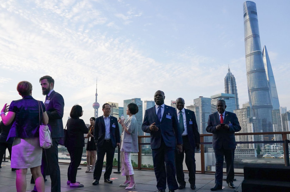 坐落于BFC外滩金融中心的复鑫艺术中心,致力于促进中国与国际文化艺术的沟通交流。整个建筑融汇中西特色,因金色可转动幕帘,被称为“会跳舞的房子”,这里长期举办中外重要当代艺术展览及公共教育活动。在复鑫艺术中心“外滩最美天台”,驻华外交官们举起手机,与浦江两岸繁华景色同框留影。