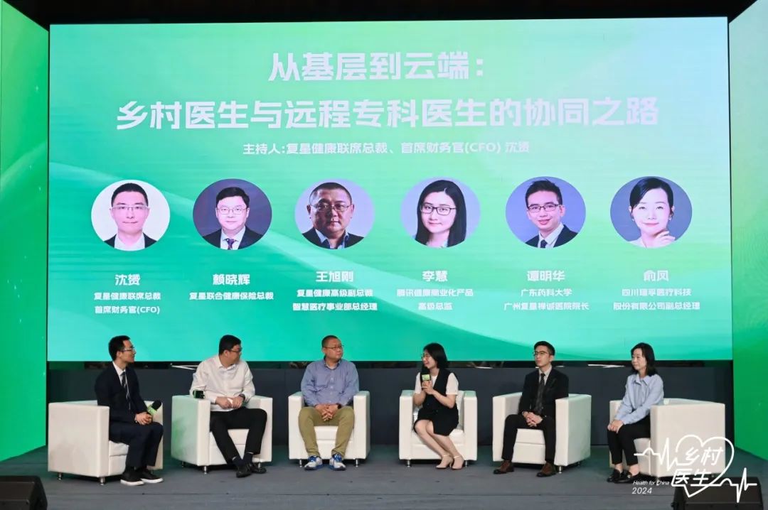 在圆桌论坛“从基层到云端:乡村医生与远程专科医生的协同之路”上,复鑫健康联席总裁、首席财务官沈赟,复鑫联合健康保险总裁赖晓辉,复鑫健康高级副总裁、智慧医疗事业部总经理王旭刚,腾讯健康战略及产品商业化高级总监李慧,广东药科大学广州复鑫禅诚医院院长谭明华,四川瑞孚医疗科技股份有限公司副总经理俞凤围绕该话题,分享了各自的经验和洞见。