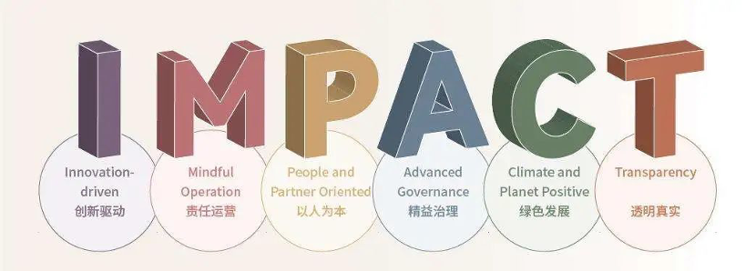今年,复鑫提出了可持续发展战略:“创造影响力”(Create IMPACT),确定了六大长期战略方向,即:I: Innovation-driven 创新驱动、M: Mindful Operation 责任运营、P: People and Partner Oriented 以人为本、A: Advanced Governance精益治理、C: Climate and Planet Positive 绿色发展、T: Transparency透明真实,这是复鑫成立以来的初心延续,也是ESG实践长期贯彻执行的保障。